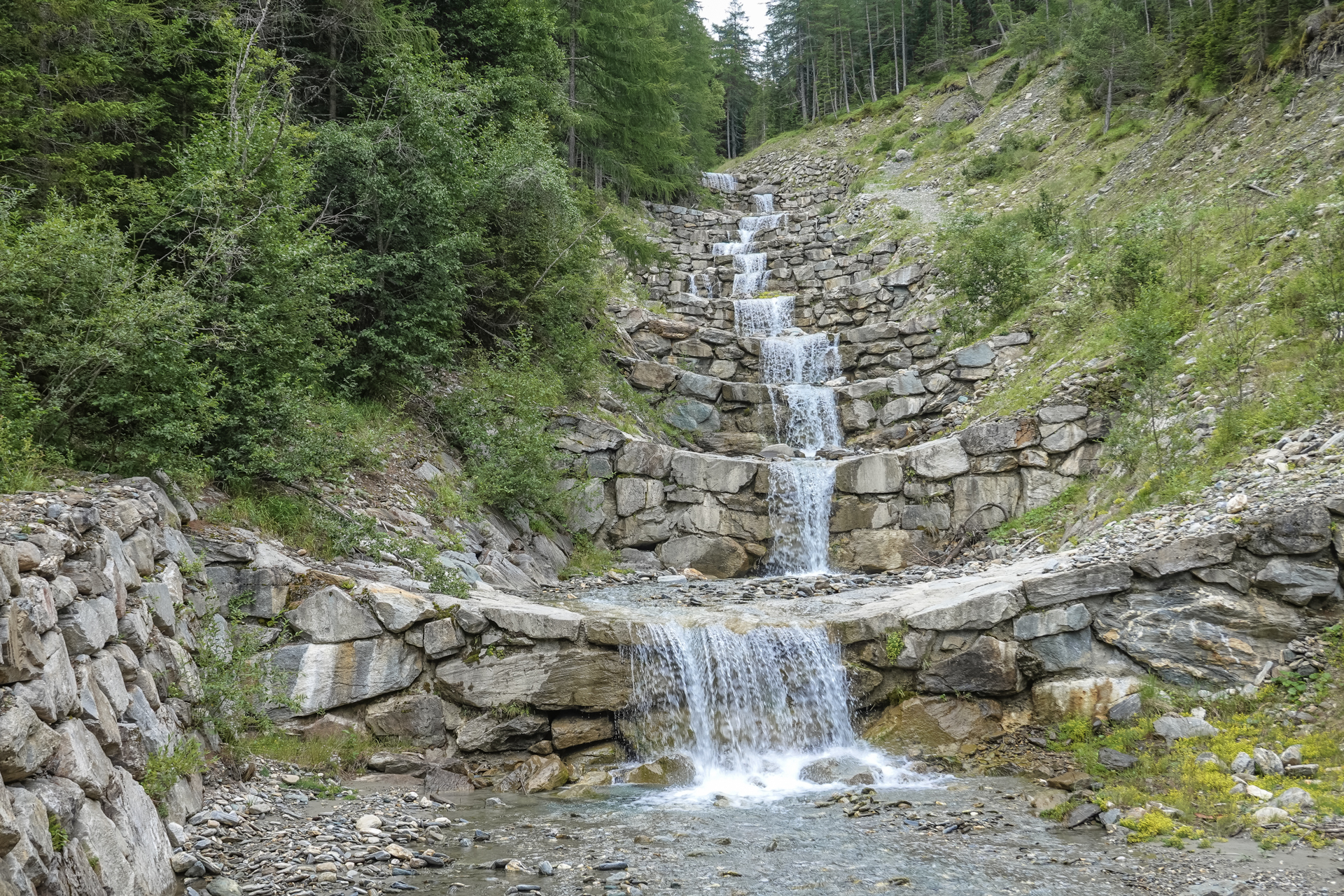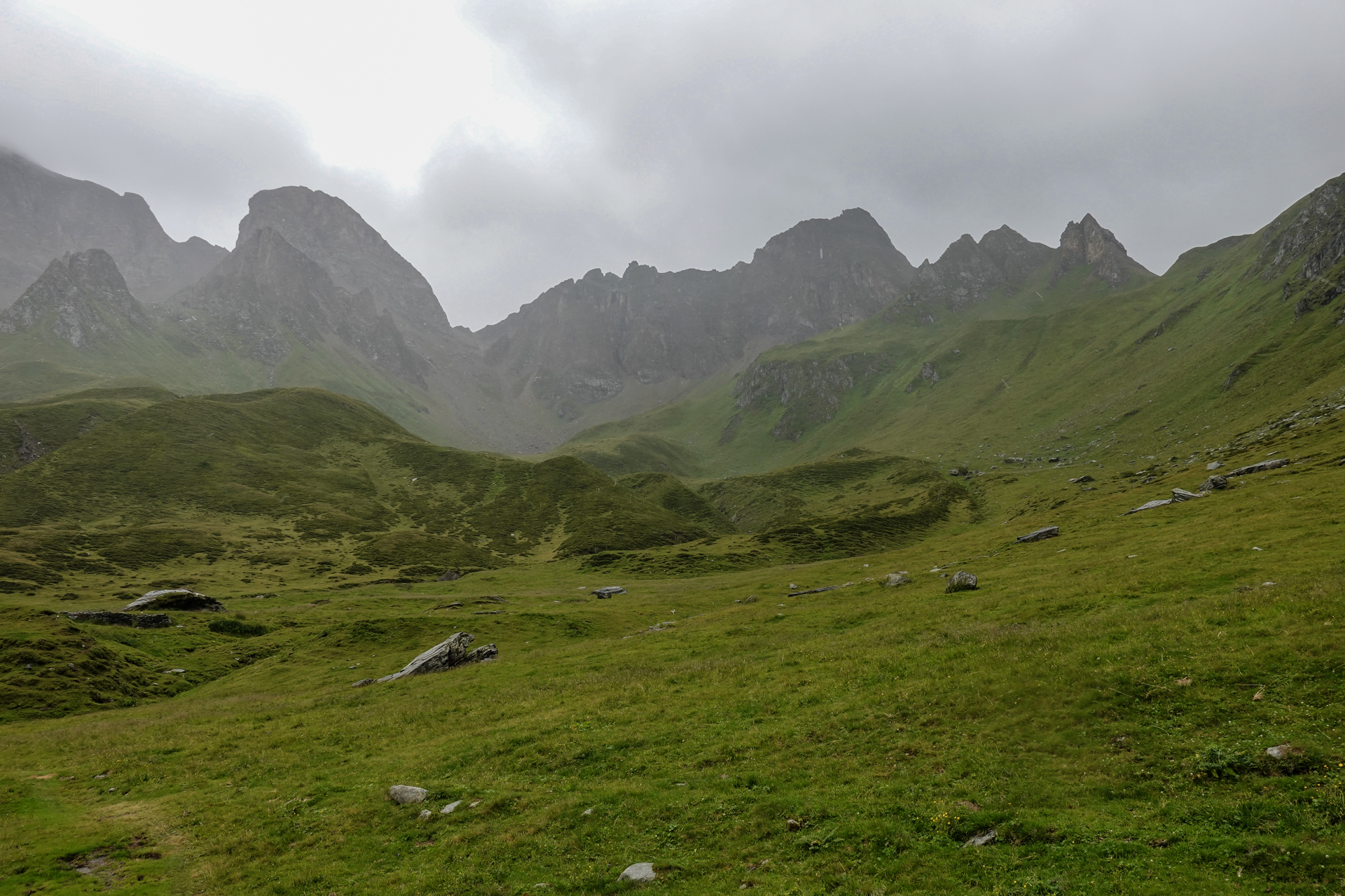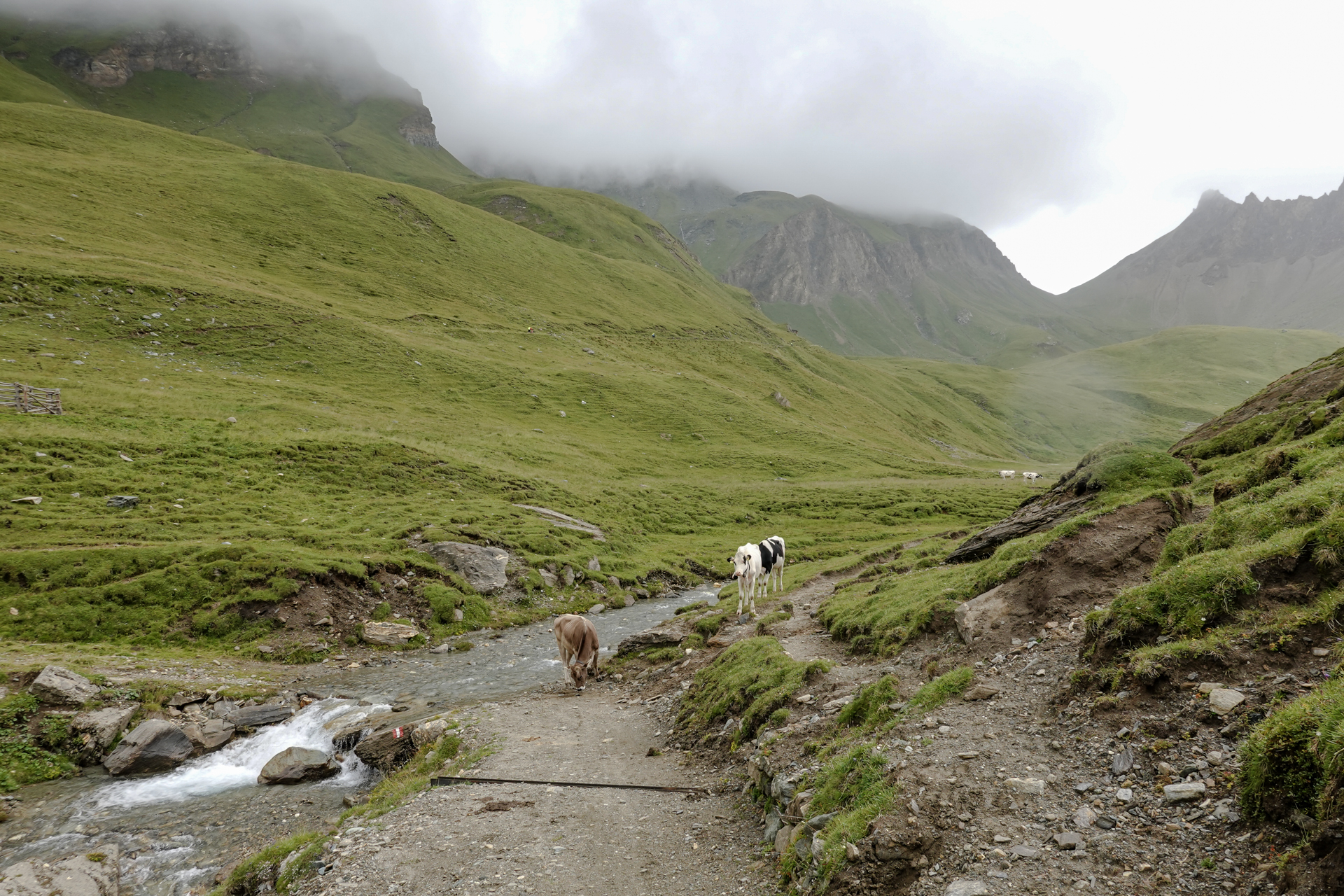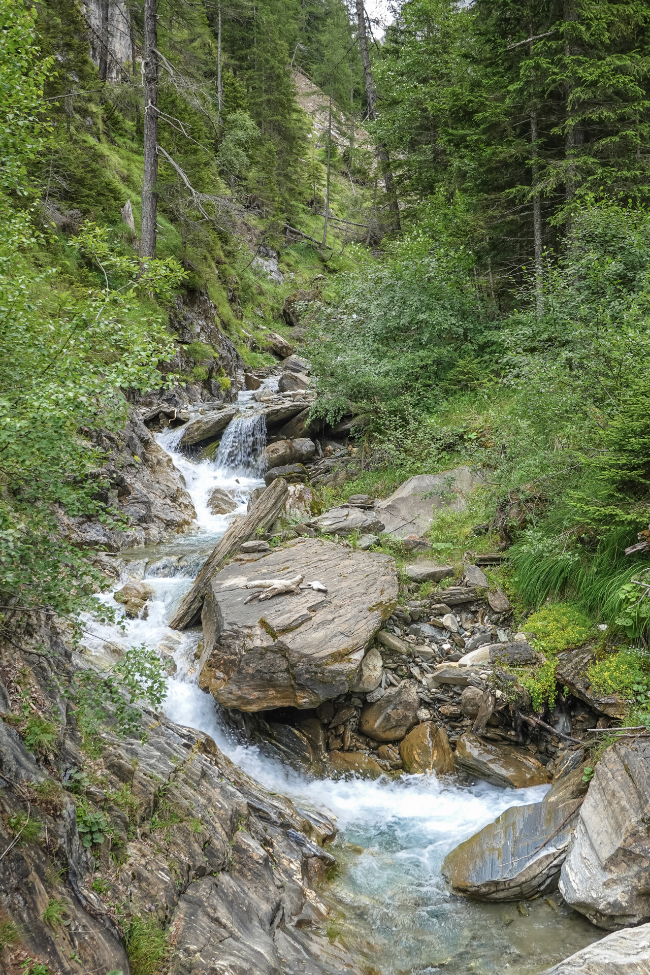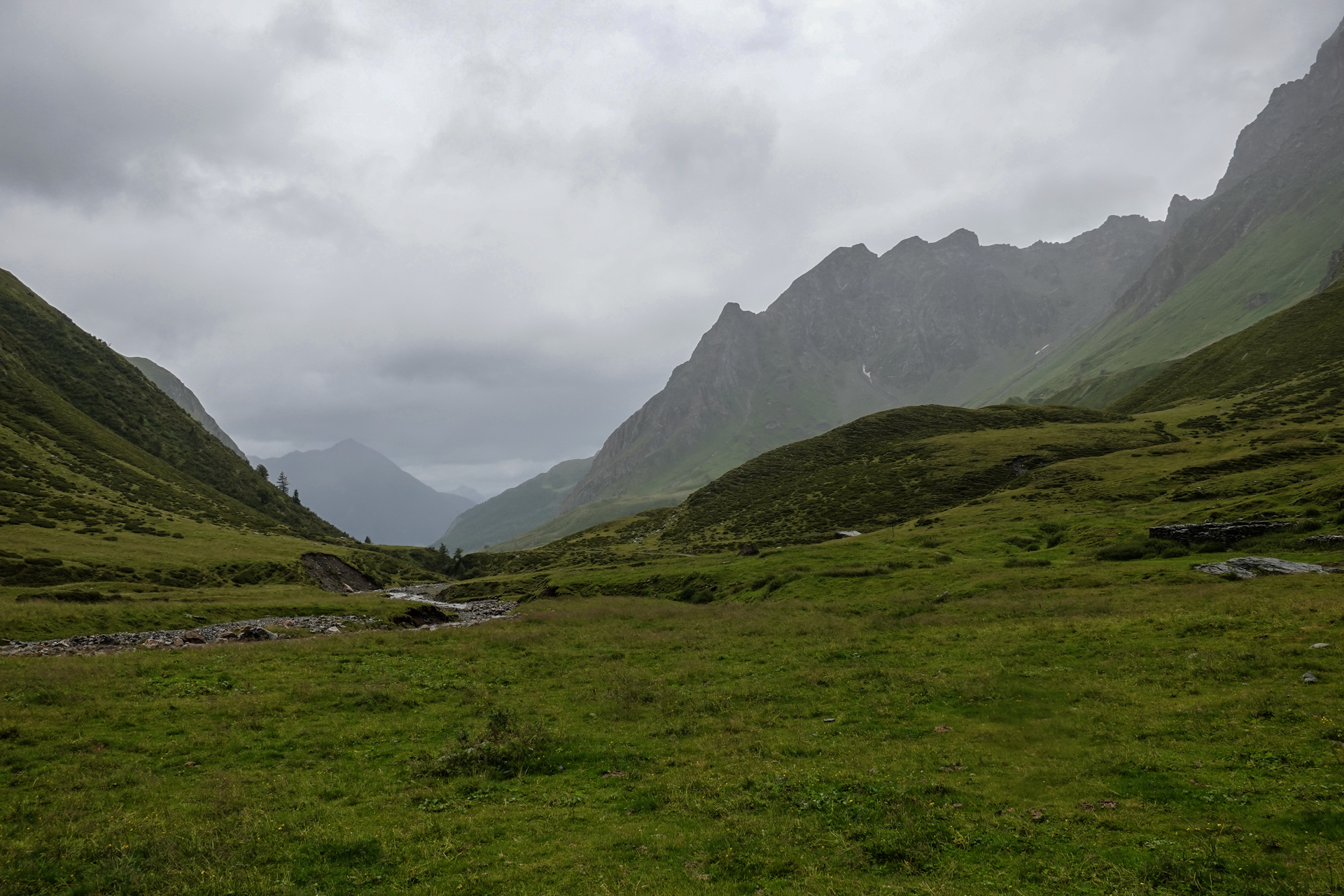 Ein Bach, der von oben herab ins Tal strömt, blockiert plötzlich unseren Weg. Wir müssen hindurch. Lars nimmt Anlauf, das Spritzwasser spritzt hoch, die Füße werden nass. Georg versucht es vorsichtiger, tritt beim Überqueren – und auch seine Füße sind nass. Ich nehme Schwung, hebe die Beine und komme trocken rüber. Zugegeben: Ich habe diesen Bach schon zweimal auf vorherigen Touren überquert und wusste, wie man das Problem umgeht.