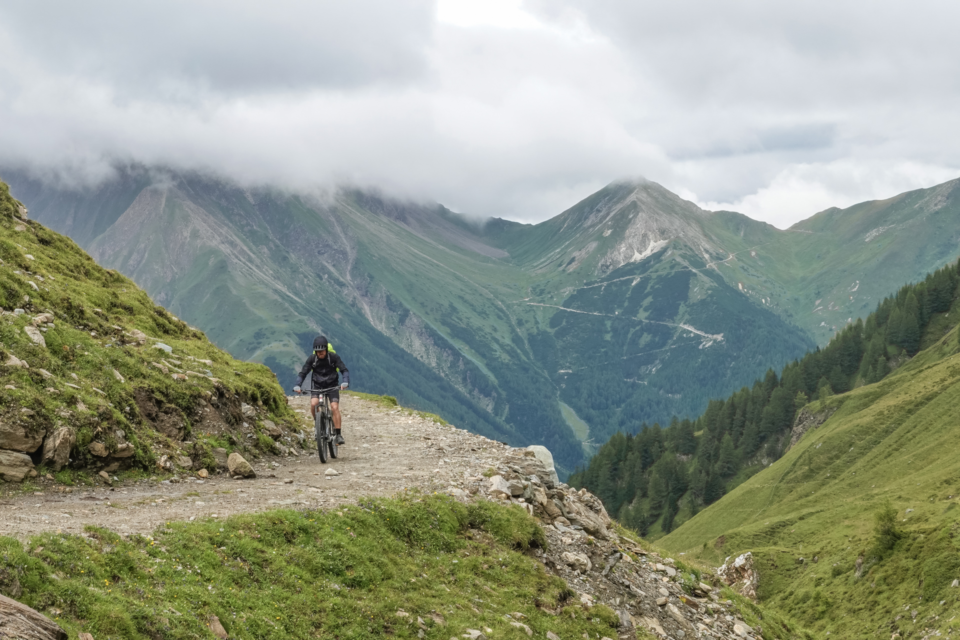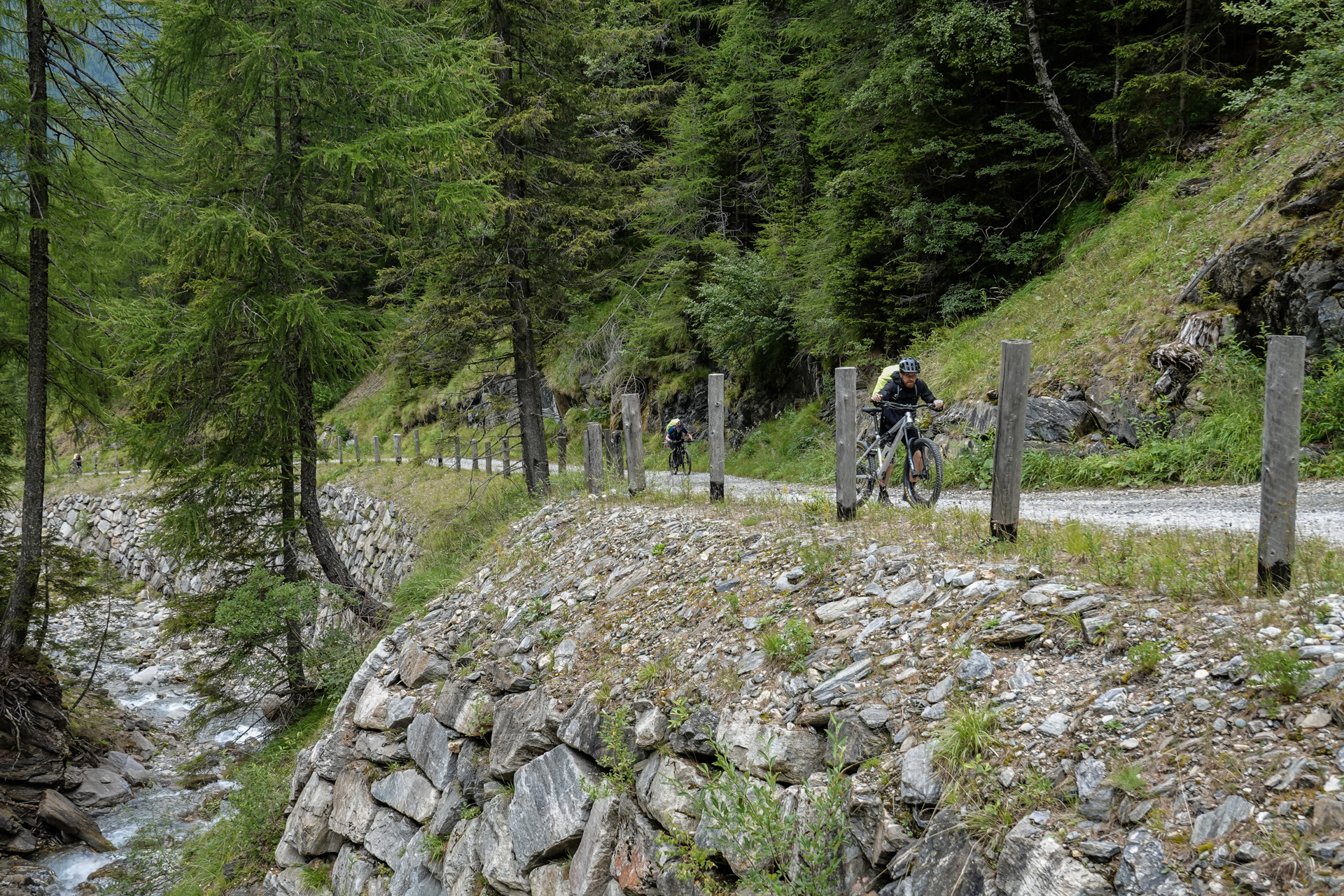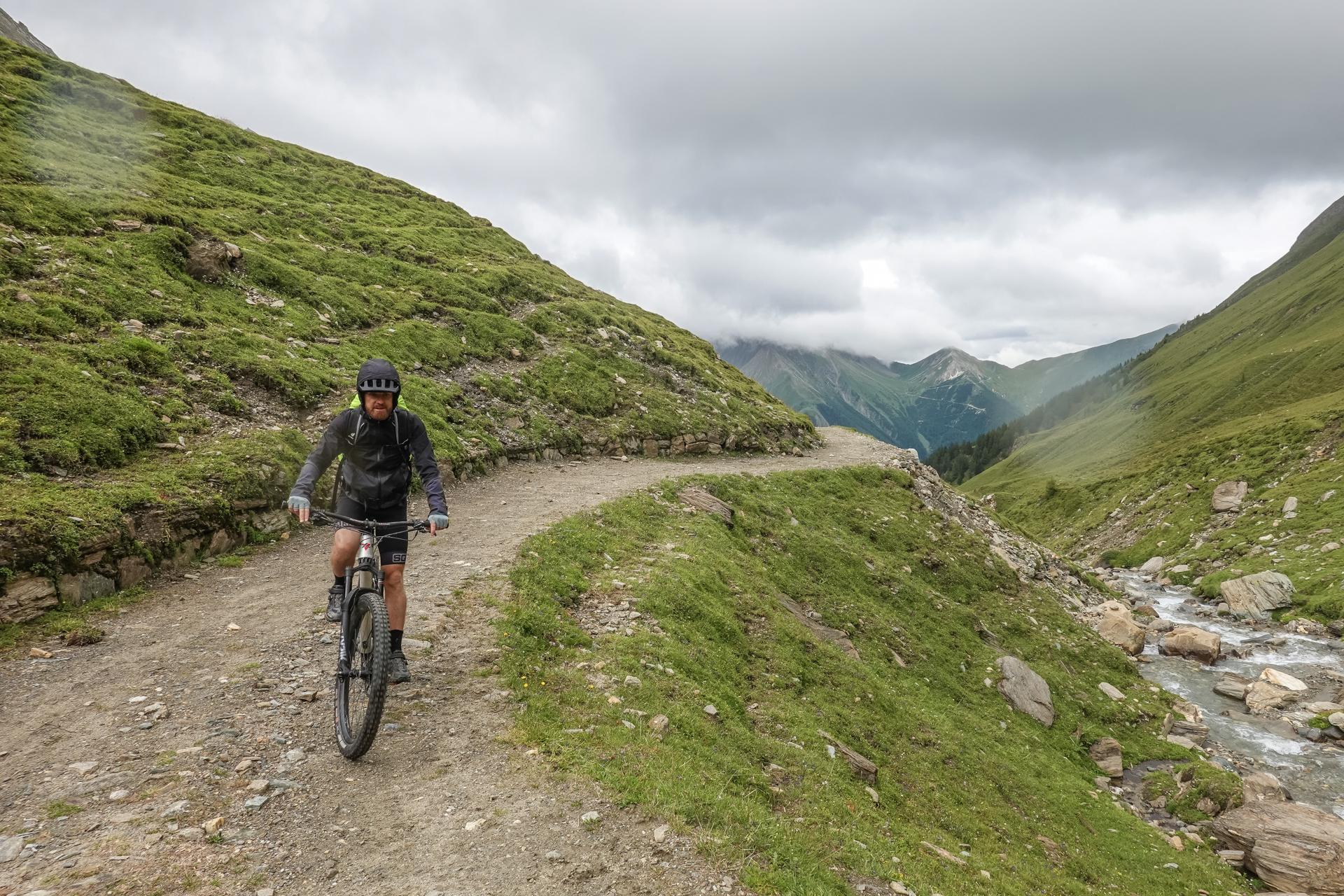 Die heutige Etappe hält ein echtes Brett bereit: 1.250 Höhenmeter auf nur acht Kilometern – nüchtern betrachtet harte Zahlen, in der Realität ein Anstieg, der weniger gefahren als geschoben wird. Aber landschaftlich bietet er alles, was das Bergfahrerherz begehrt: eine atemberaubende Kulisse, wilde Natur, Ruhe und Einsamkeit. So ist der Aufstieg zum Pfunderer Joch.