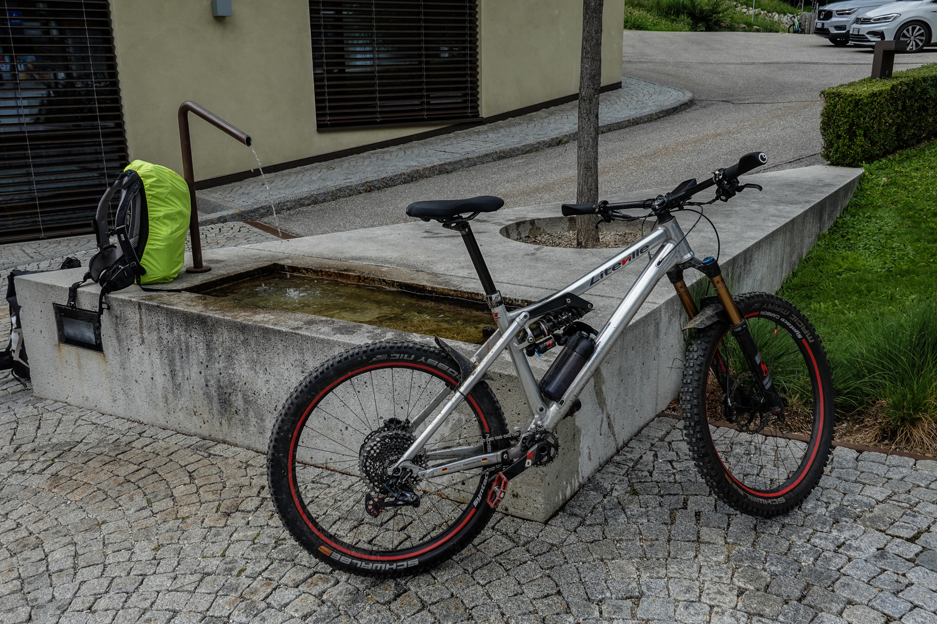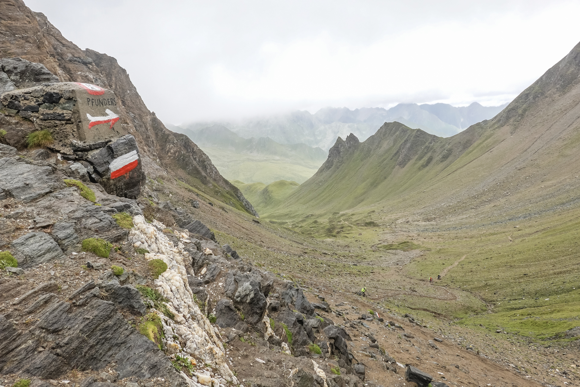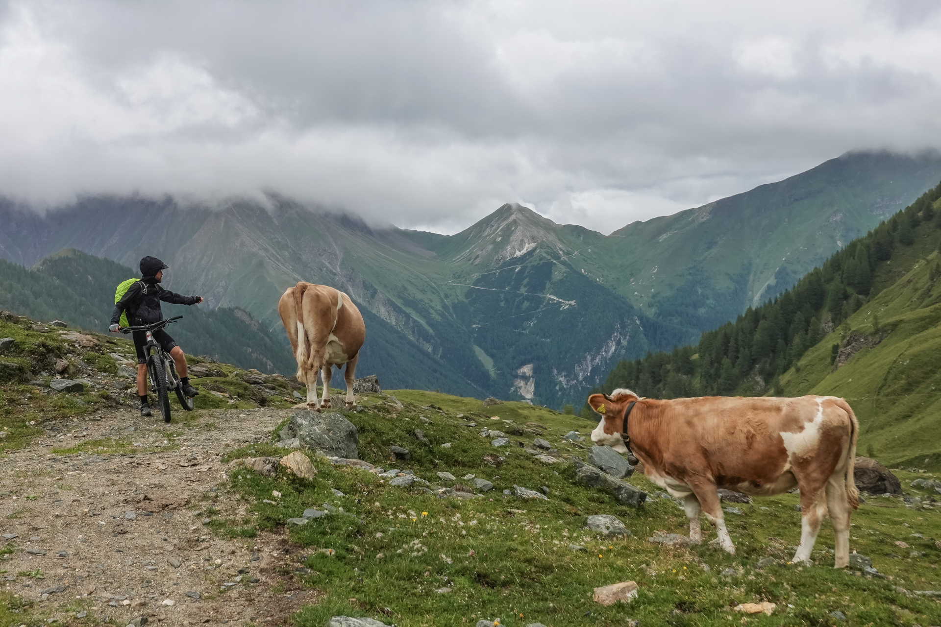 Die heutige Etappe hält ein echtes Brett bereit: 1.250 Höhenmeter auf nur acht Kilometern – nüchtern betrachtet harte Zahlen, in der Realität ein Anstieg, der weniger gefahren als geschoben wird. Aber landschaftlich bietet er alles, was das Bergfahrerherz begehrt: eine atemberaubende Kulisse, wilde Natur, Ruhe und Einsamkeit. So ist der Aufstieg zum Pfunderer Joch.