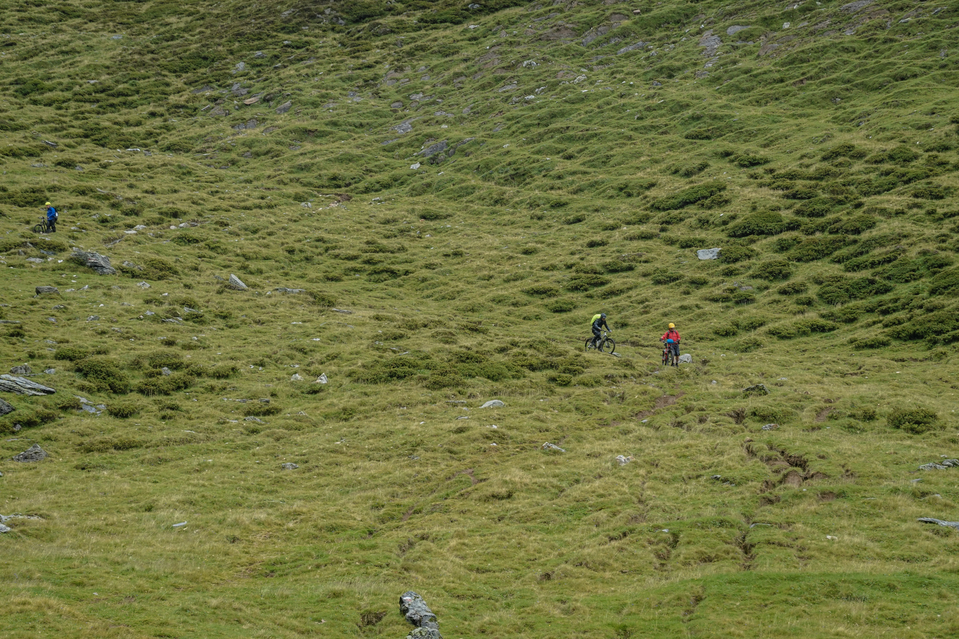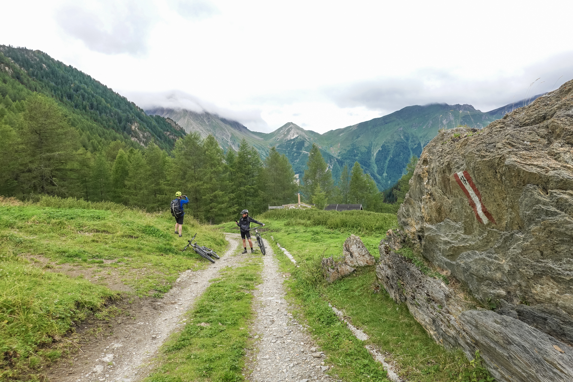 Die Abfahrt zur Weitenbergalm fordert uns erneut: technisch anspruchsvoll, matschige Passagen, enge und steile Trails, dazu loses Geröll. Ich kenne das Pfunderer Joch bereits aus früheren Touren, aber diesmal ist der Weg noch stärker von Erosion gezeichnet. Grober Schotter, lose Steine und ausgewaschene Rinnen verlangen volle Konzentration und Trittsicherheit. Trotzdem meistern wir auch diesen Abschnitt.
