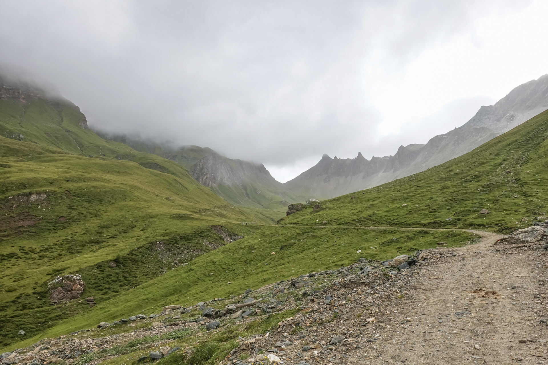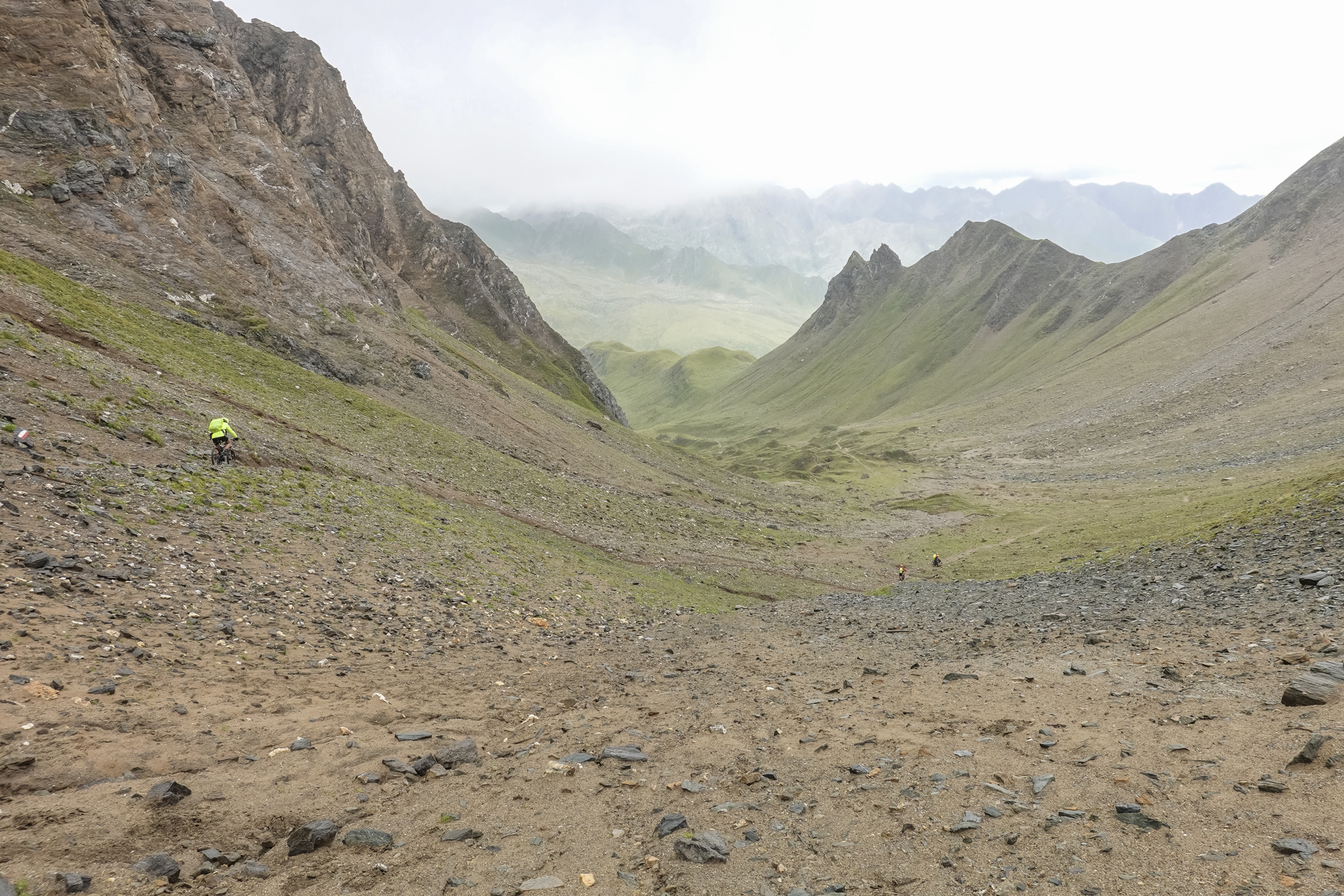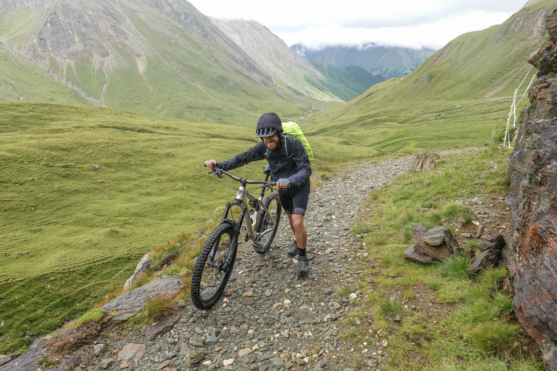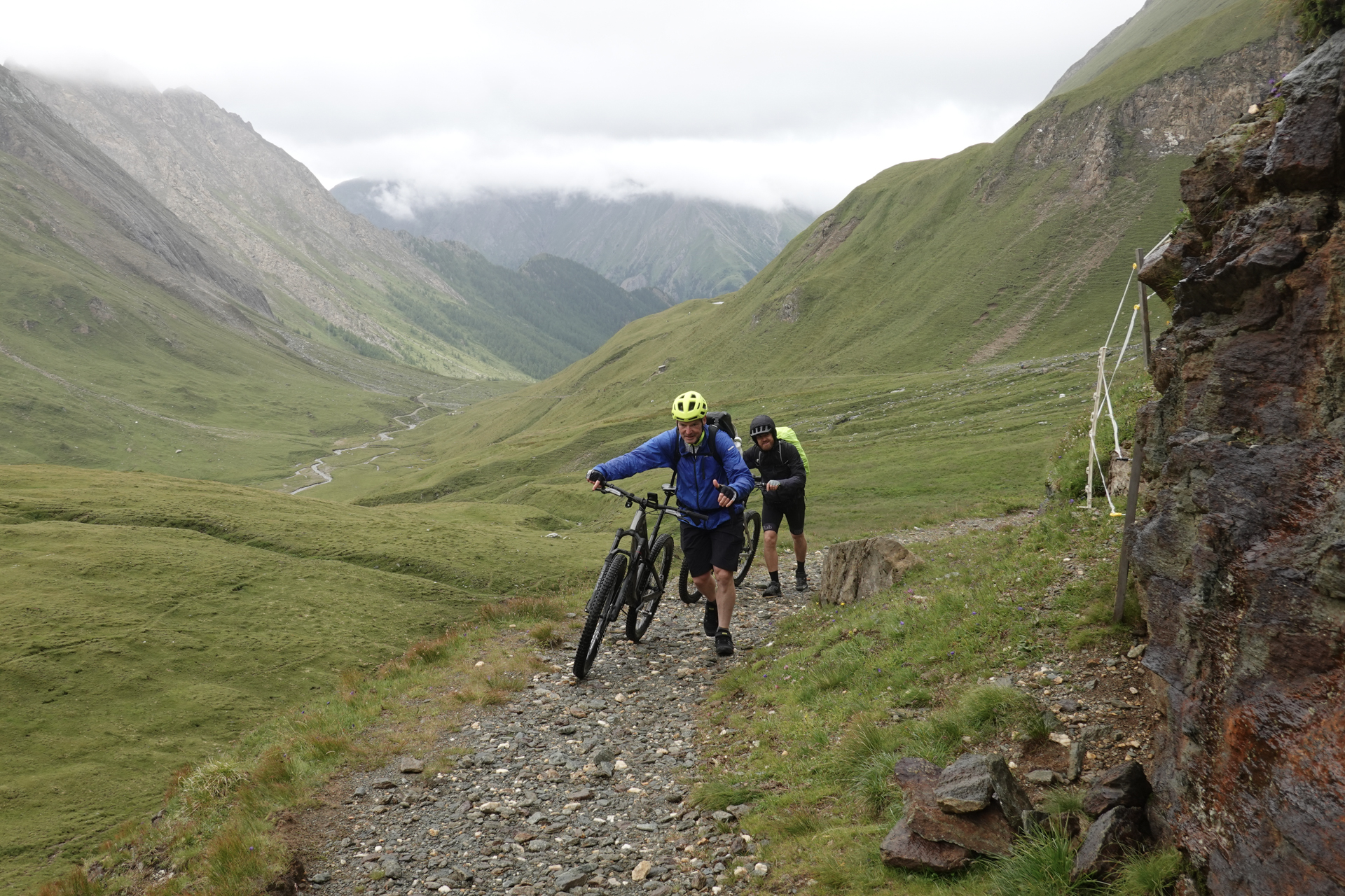 Der Aufstieg ist so fordernd wie erwartet. Die Steigung ist brutal, der Weg schmal, steinig und technisch herausfordernd – das Bike wird über weite Strecken geschoben. Doch das Panorama entschädigt für jede Anstrengung. Ich habe das Joch schon im August mit Schnee erlebt, und es laufen Wetten, ob es dieses Jahr ebenfalls so sein wird.