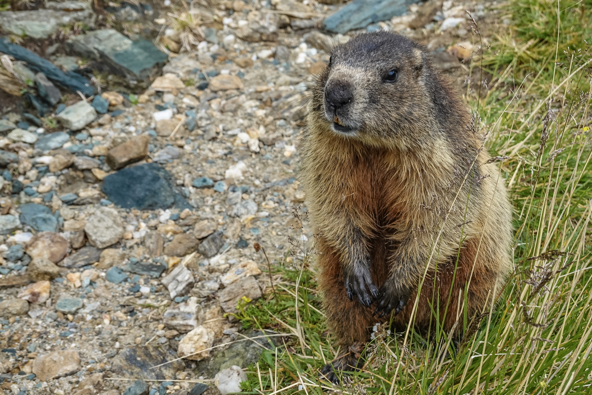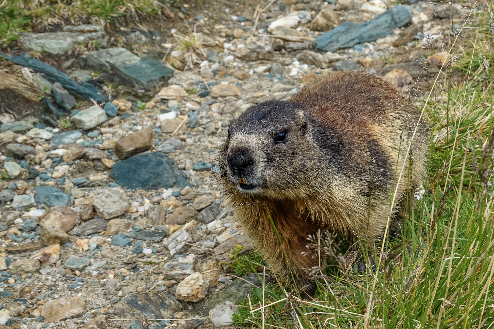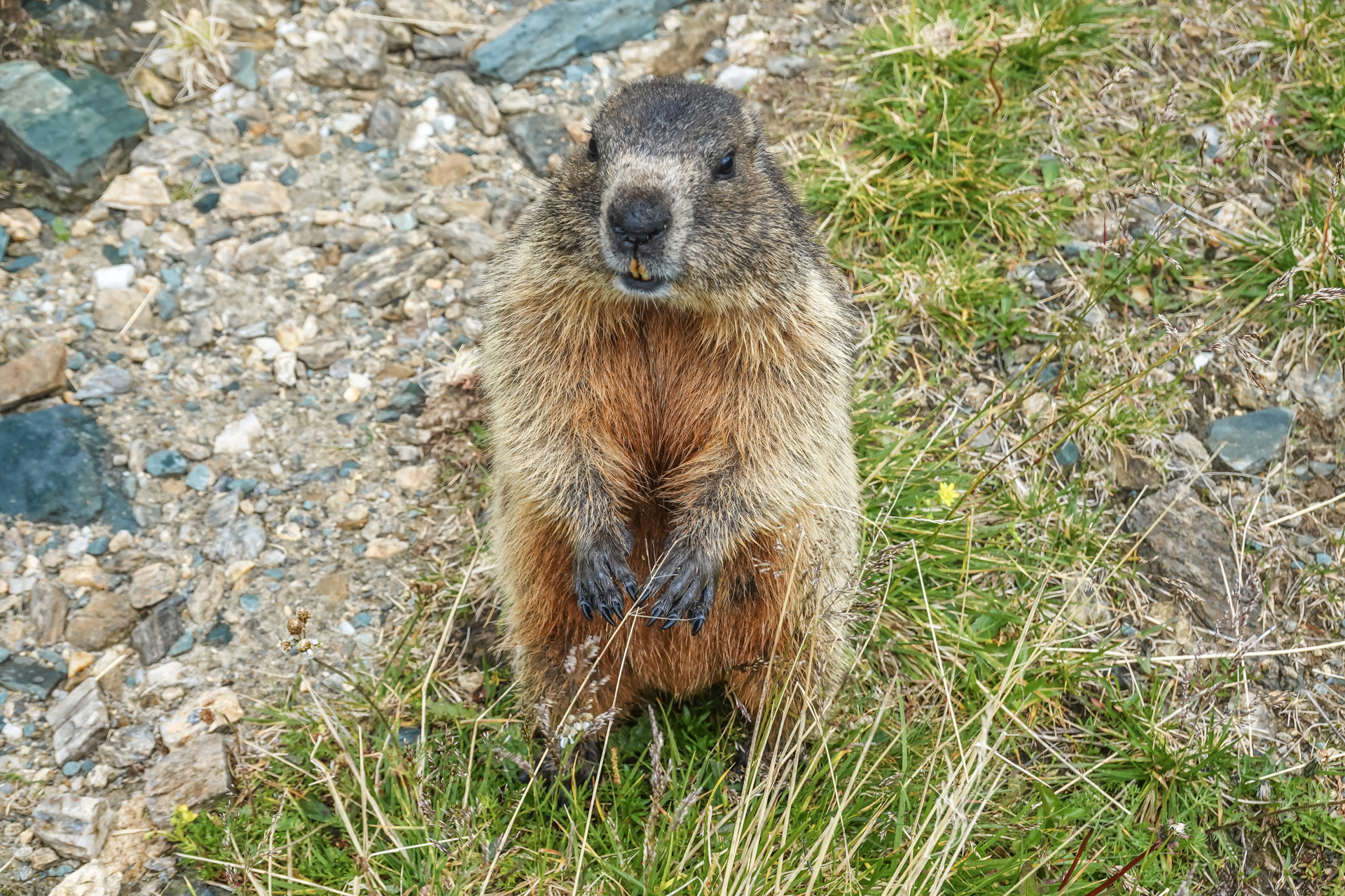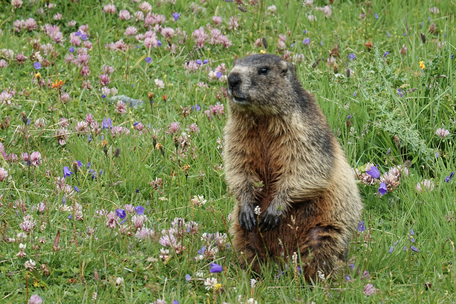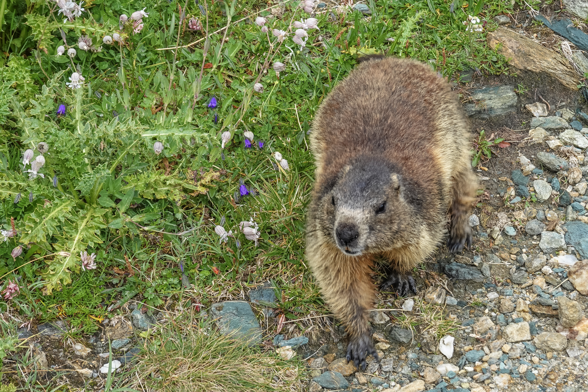 Es wird steiler und enger. Wir schieben, schwitzen und hören das Pfeifen der Murmeltiere. Plötzlich kommt eines direkt auf uns zu. Wir bleiben stehen, machen Fotos – und tatsächlich, es bettelt fast schon um etwas Essbares. Offenbar wird es hier von Bikern und Wanderern angefüttert, denn normalerweise sind diese Tiere äußerst scheu. Drei, vier Serpentinen und einige Höhenmeter später stehen wir auf dem Pass. Schneefrei, kühl, leicht sonnig – wir sind erleichtert und glücklich.