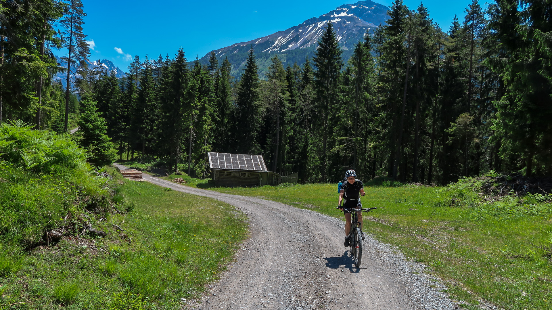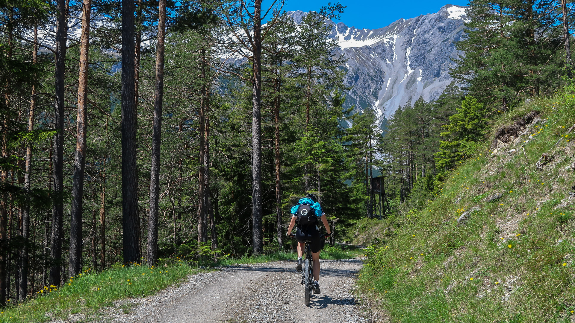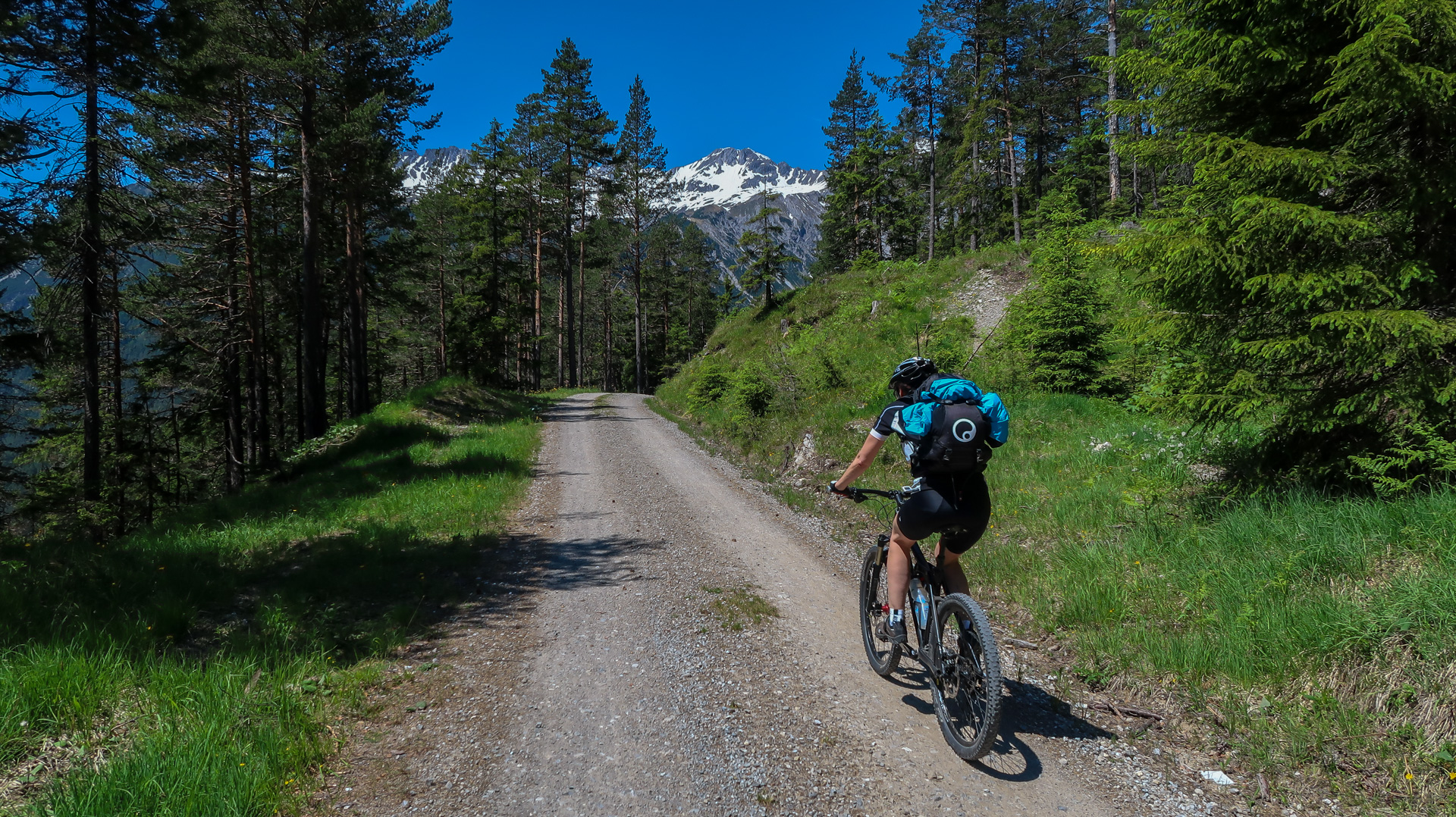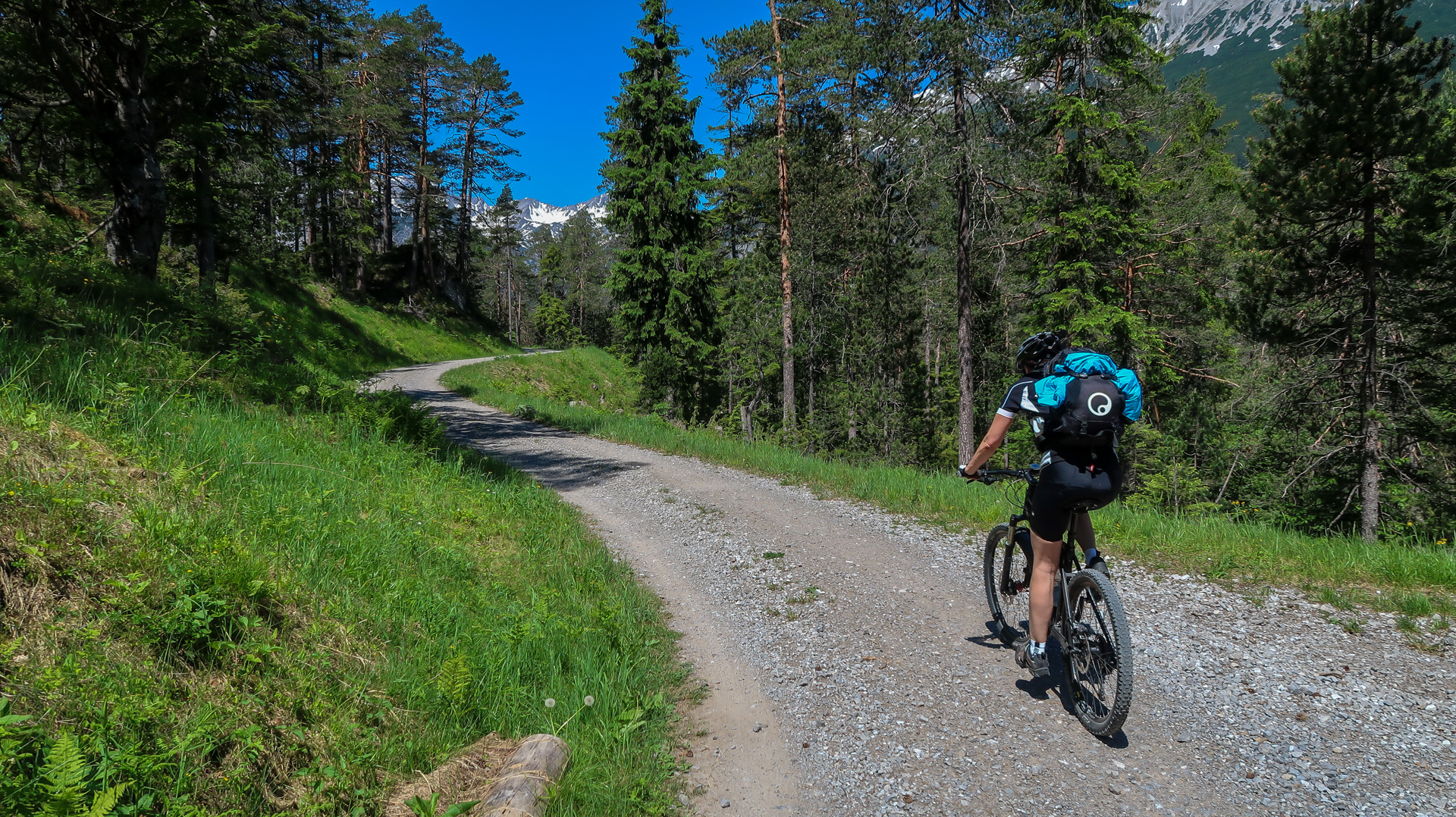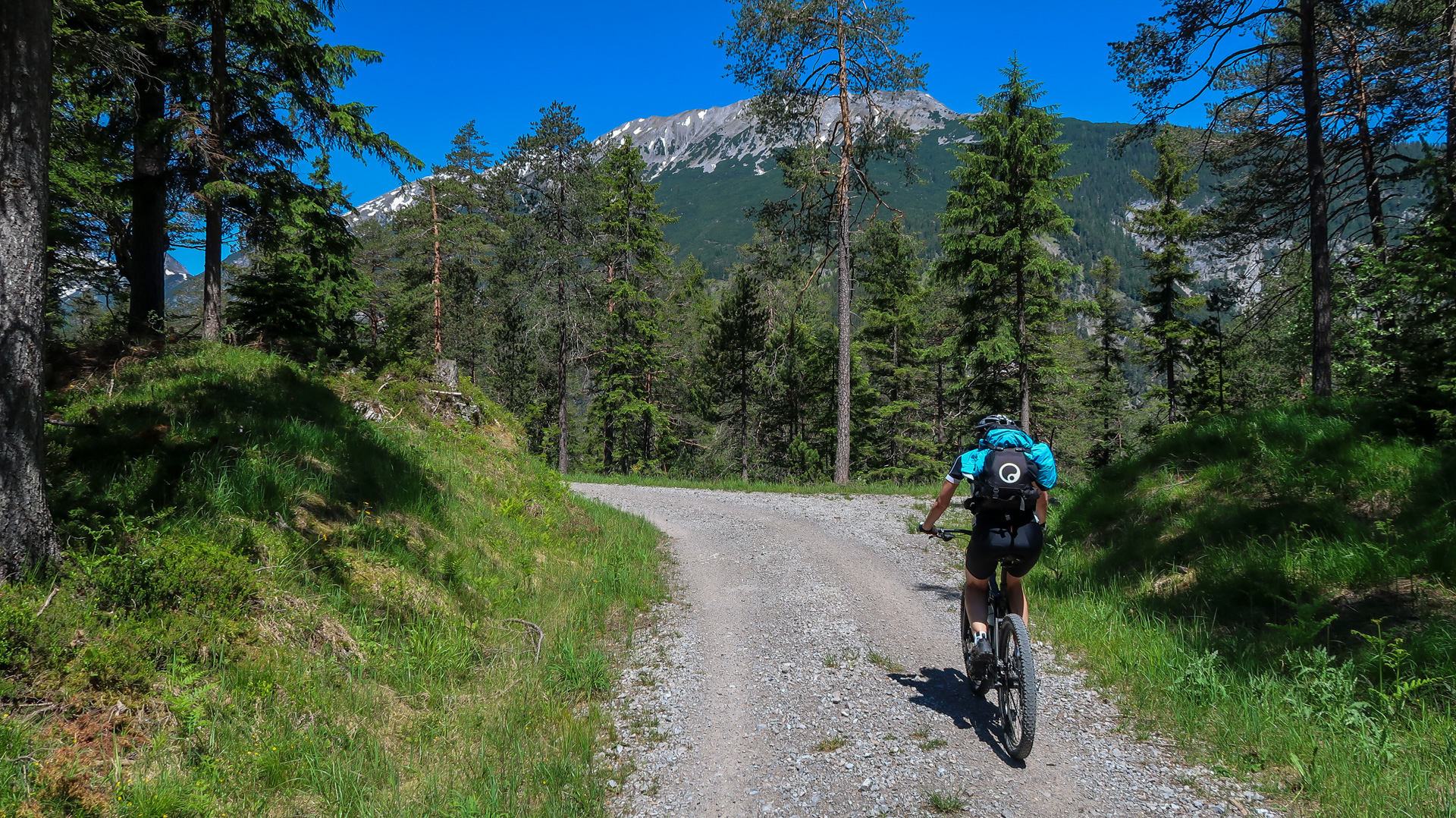 Am Ortsausgang in Ehrwald verlassen wir am Kreisel die Straße und treffen auf einen wunderschönen Lärchenwald. Der Boden ist komplett mit Gras besetzt, die Sonne scheint durch die Baumkronen, ein herrliches Bild. Die ersten Eindrücke begeistern auch Simone, sie ist voller Tatendrang. Der Weg führt am Hang entlang, mal mehr mal weniger steil, an einer Stempelstelle für Wanderer vorbei und letztendlich über einen Trail auf einer Skipiste wieder hinab zur Sommerrodelbahn von Bieberwehr. Ein obligatorisches Foto an einer Bachüberquerung, dann gehts weiter. Am Weißensee gönnen wir uns eine kleine Pause, schauen den Kühen zu, die im See eine Erfrischung genießen, dann geht es richtig los – der Start zum Pass. Ein breiter, sehr gut zu fahrender Schotterweg schlängelt sich den Berg hinauf. Ich erinnerte mich an 2006, da gab es eine Stelle, die sehr heftig war und wir den Berg auf der total verblockten mit Steinbrocken übersäten Via Claudia hochschieben mussten. Dieser Weg gibt es zwar immer noch, man kann ihn aber toll per Serpentinen umfahren. Auch der Schotterweg ist jetzt viel feiner wie damals und echt super zu fahren.