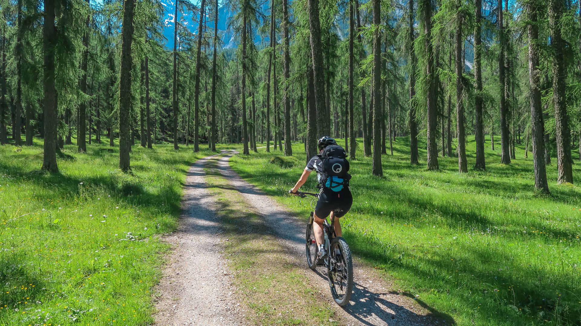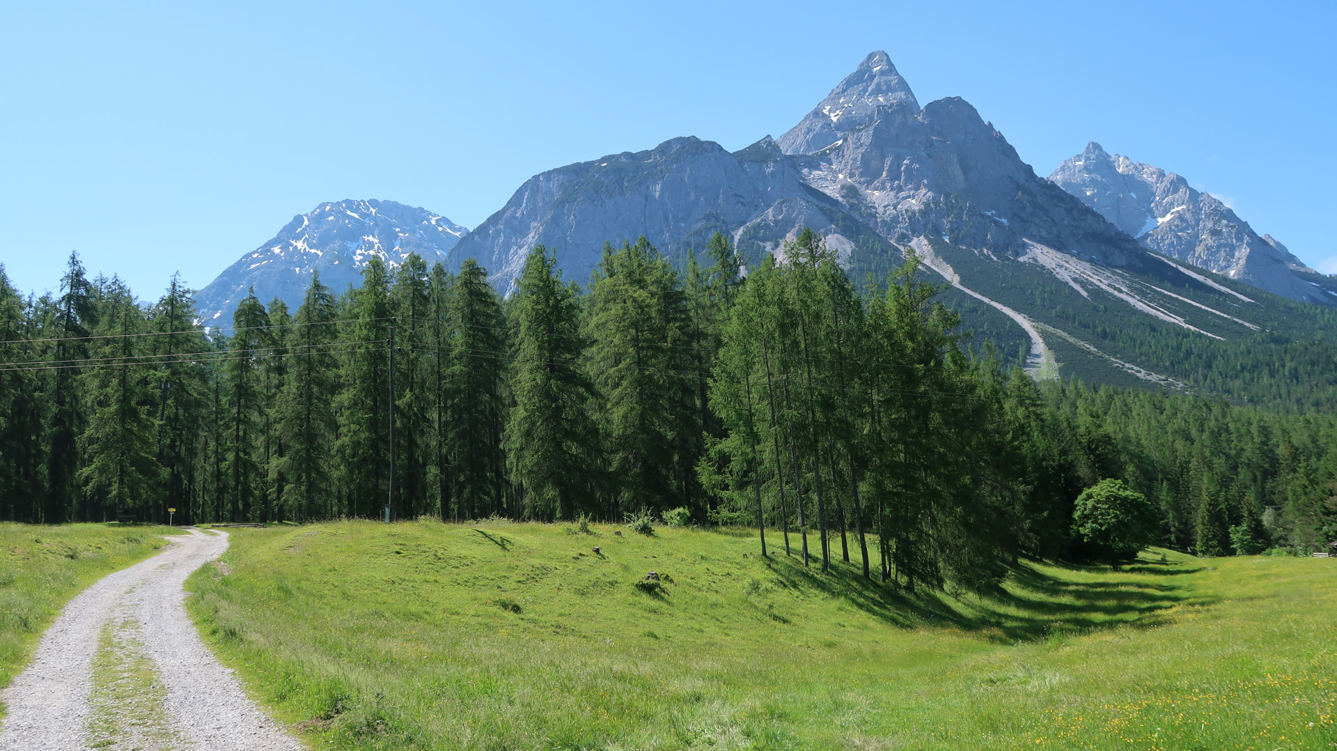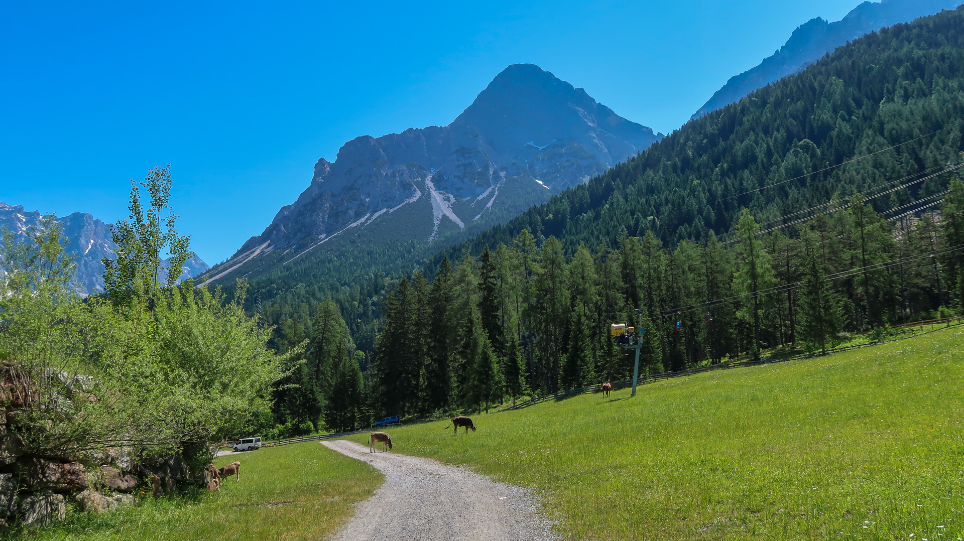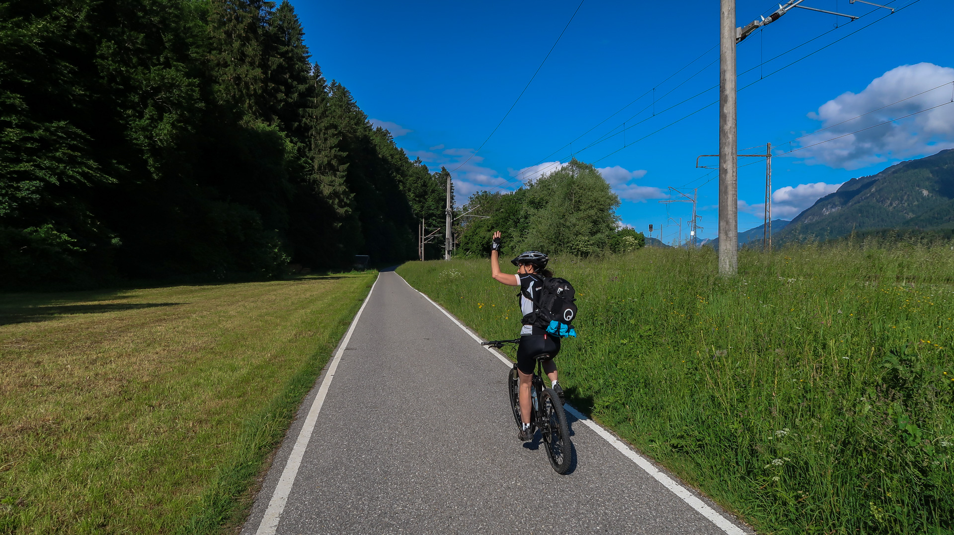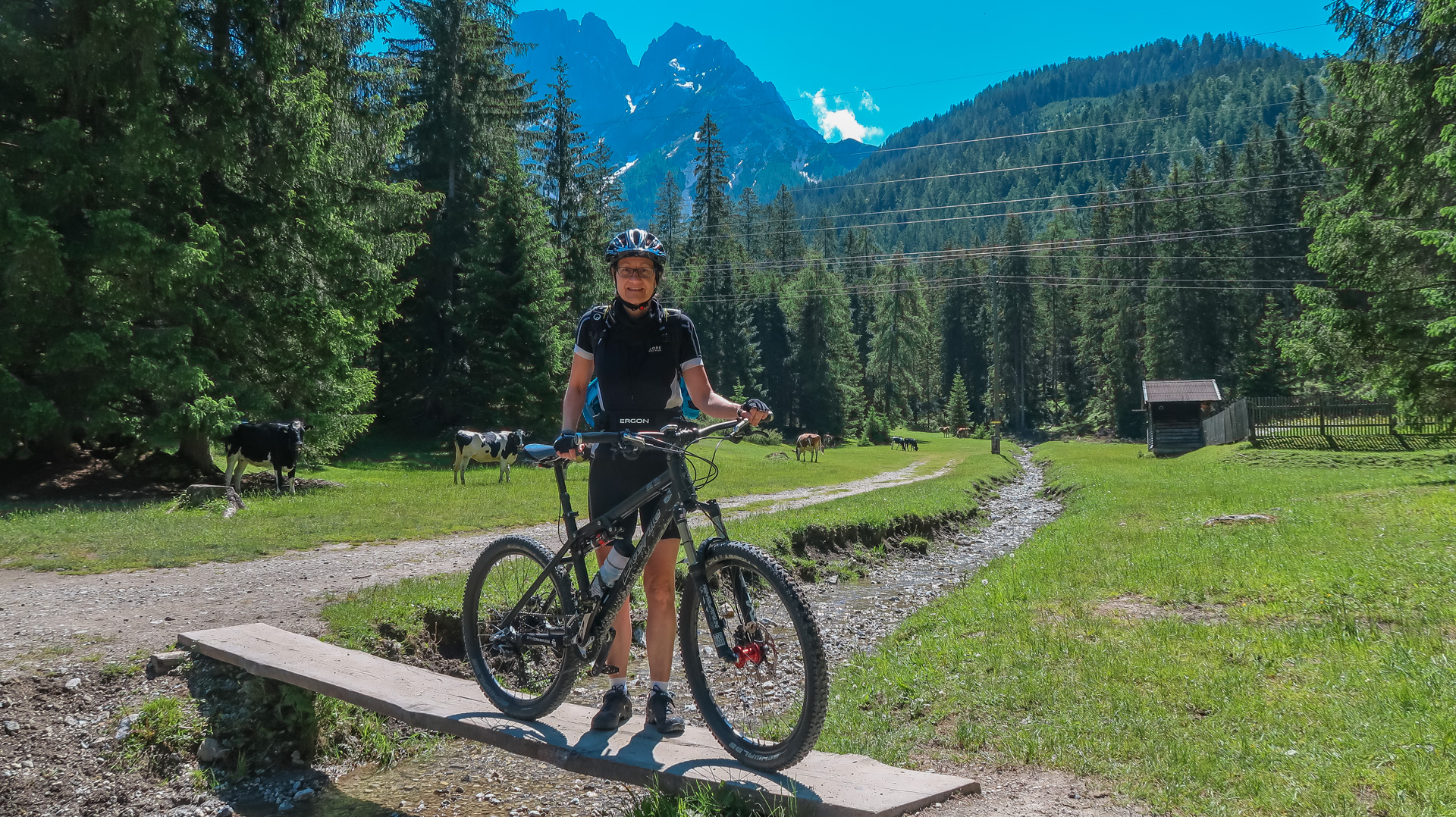 Am Ortsausgang in Ehrwald verlassen wir am Kreisel die Straße und treffen auf einen wunderschönen Lärchenwald. Der Boden ist komplett mit Gras besetzt, die Sonne scheint durch die Baumkronen, ein herrliches Bild. Die ersten Eindrücke begeistern auch Simone, sie ist voller Tatendrang. Der Weg führt am Hang entlang, mal mehr mal weniger steil, an einer Stempelstelle für Wanderer vorbei und letztendlich über einen Trail auf einer Skipiste wieder hinab zur Sommerrodelbahn von Bieberwehr. Ein obligatorisches Foto an einer Bachüberquerung, dann gehts weiter. Am Weißensee gönnen wir uns eine kleine Pause, schauen den Kühen zu, die im See eine Erfrischung genießen, dann geht es richtig los – der Start zum Pass. Ein breiter, sehr gut zu fahrender Schotterweg schlängelt sich den Berg hinauf. Ich erinnerte mich an 2006, da gab es eine Stelle, die sehr heftig war und wir den Berg auf der total verblockten mit Steinbrocken übersäten Via Claudia hochschieben mussten. Dieser Weg gibt es zwar immer noch, man kann ihn aber toll per Serpentinen umfahren. Auch der Schotterweg ist jetzt viel feiner wie damals und echt super zu fahren.