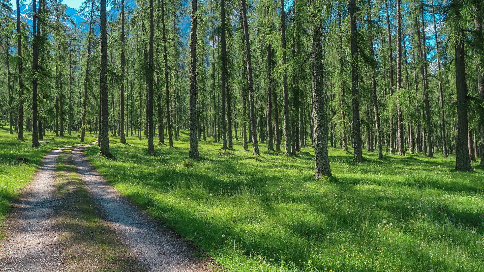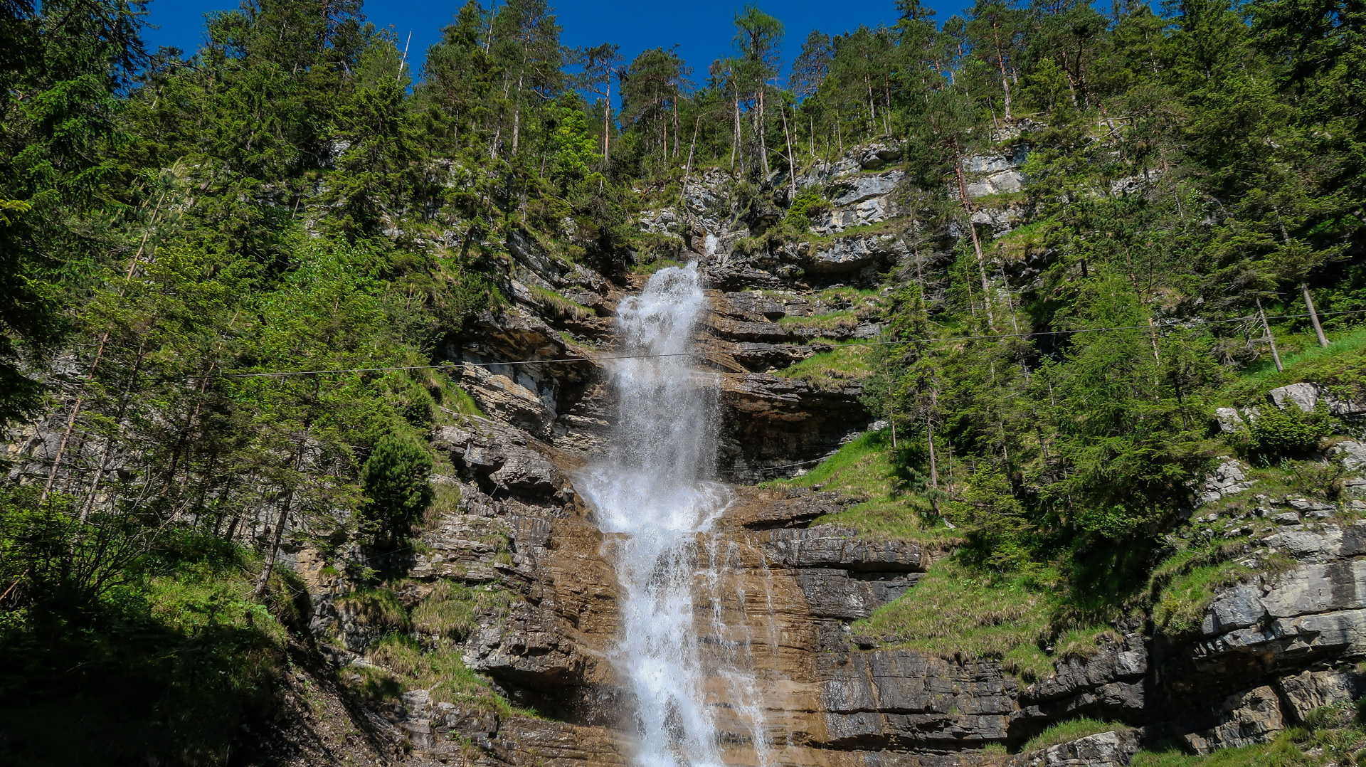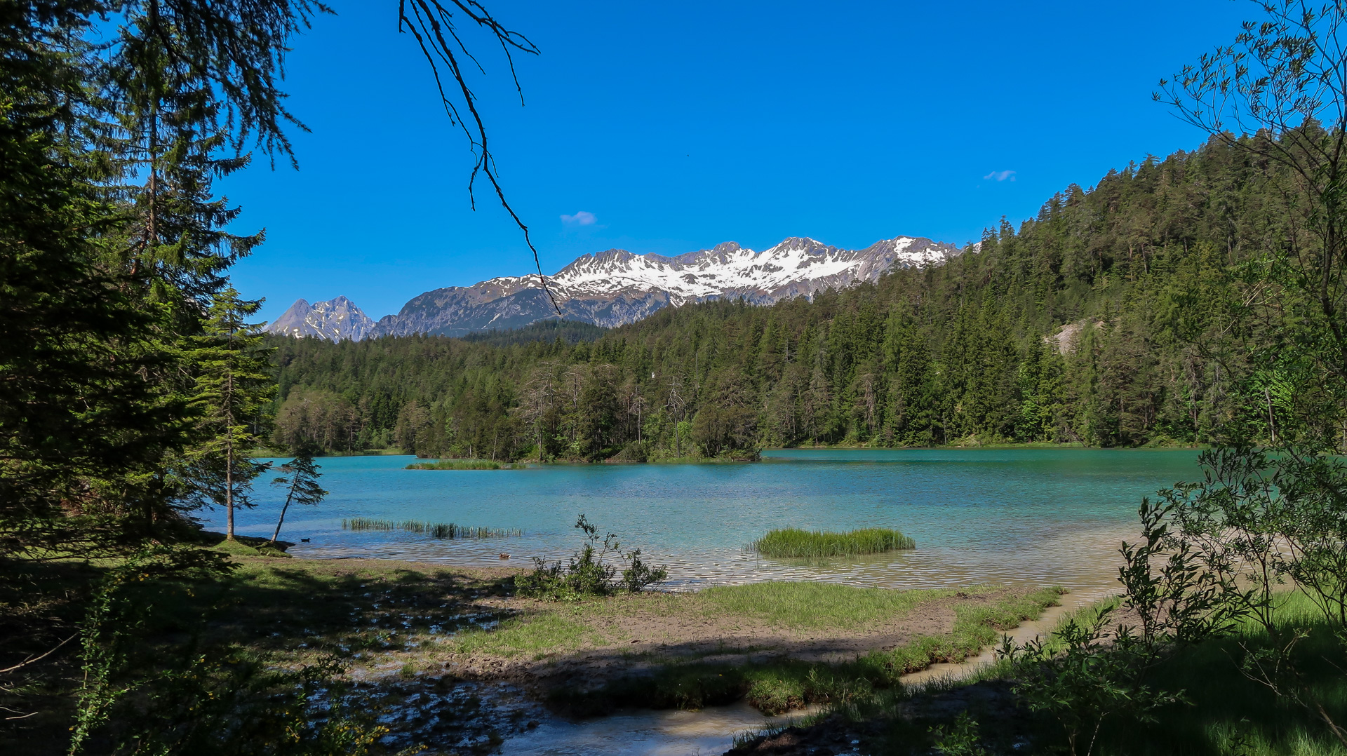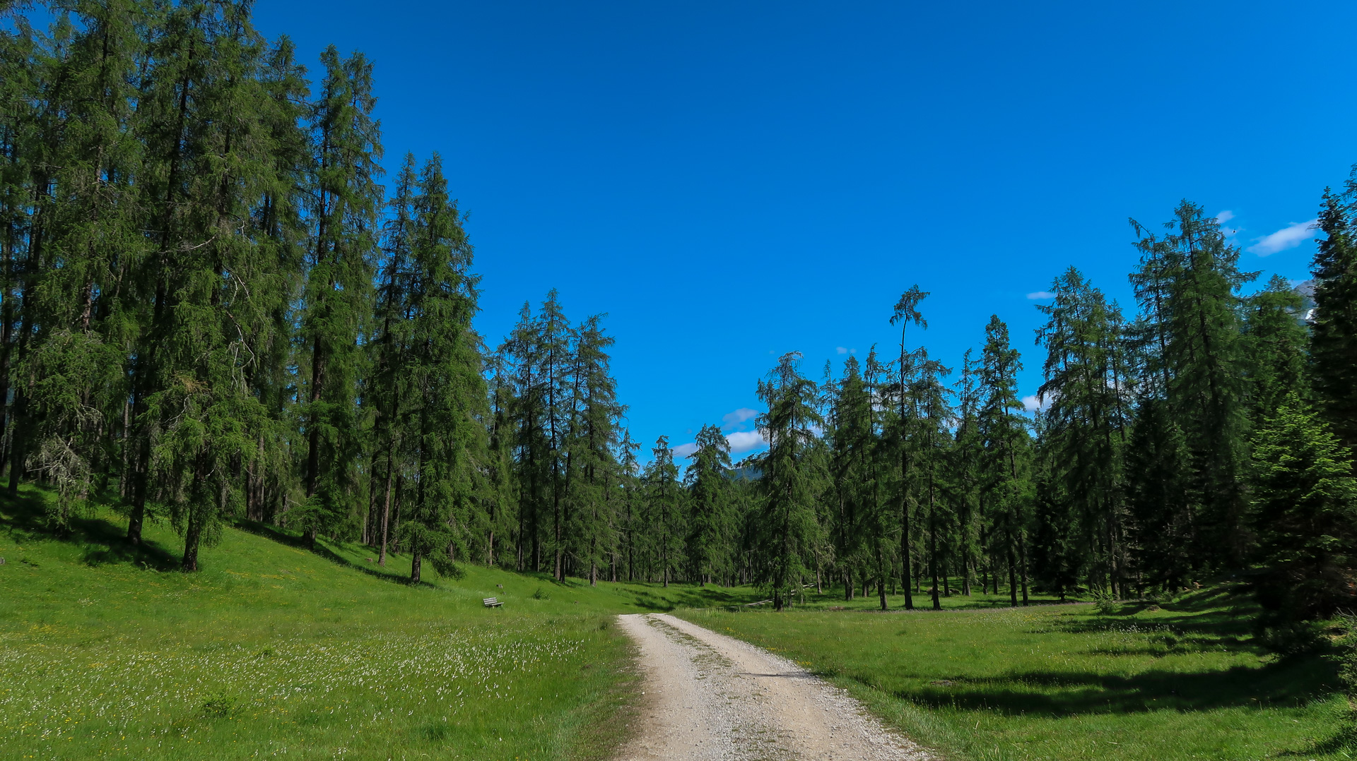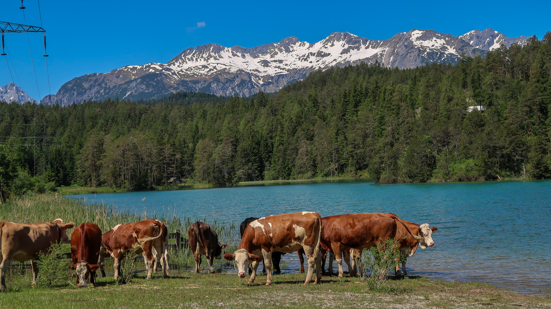 Am Ortsausgang in Ehrwald verlassen wir am Kreisel die Straße und treffen auf einen wunderschönen Lärchenwald. Der Boden ist komplett mit Gras besetzt, die Sonne scheint durch die Baumkronen, ein herrliches Bild. Die ersten Eindrücke begeistern auch Simone, sie ist voller Tatendrang. Der Weg führt am Hang entlang, mal mehr mal weniger steil, an einer Stempelstelle für Wanderer vorbei und letztendlich über einen Trail auf einer Skipiste wieder hinab zur Sommerrodelbahn von Bieberwehr. Ein obligatorisches Foto an einer Bachüberquerung, dann gehts weiter. Am Weißensee gönnen wir uns eine kleine Pause, schauen den Kühen zu, die im See eine Erfrischung genießen, dann geht es richtig los – der Start zum Pass. Ein breiter, sehr gut zu fahrender Schotterweg schlängelt sich den Berg hinauf. Ich erinnerte mich an 2006, da gab es eine Stelle, die sehr heftig war und wir den Berg auf der total verblockten mit Steinbrocken übersäten Via Claudia hochschieben mussten. Dieser Weg gibt es zwar immer noch, man kann ihn aber toll per Serpentinen umfahren. Auch der Schotterweg ist jetzt viel feiner wie damals und echt super zu fahren.