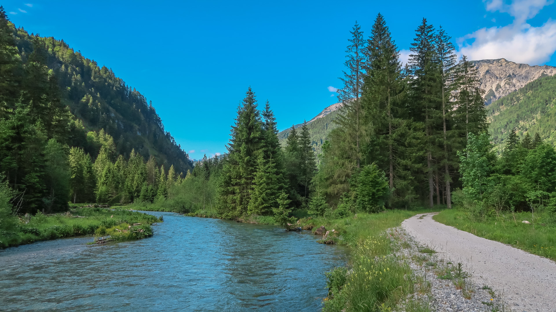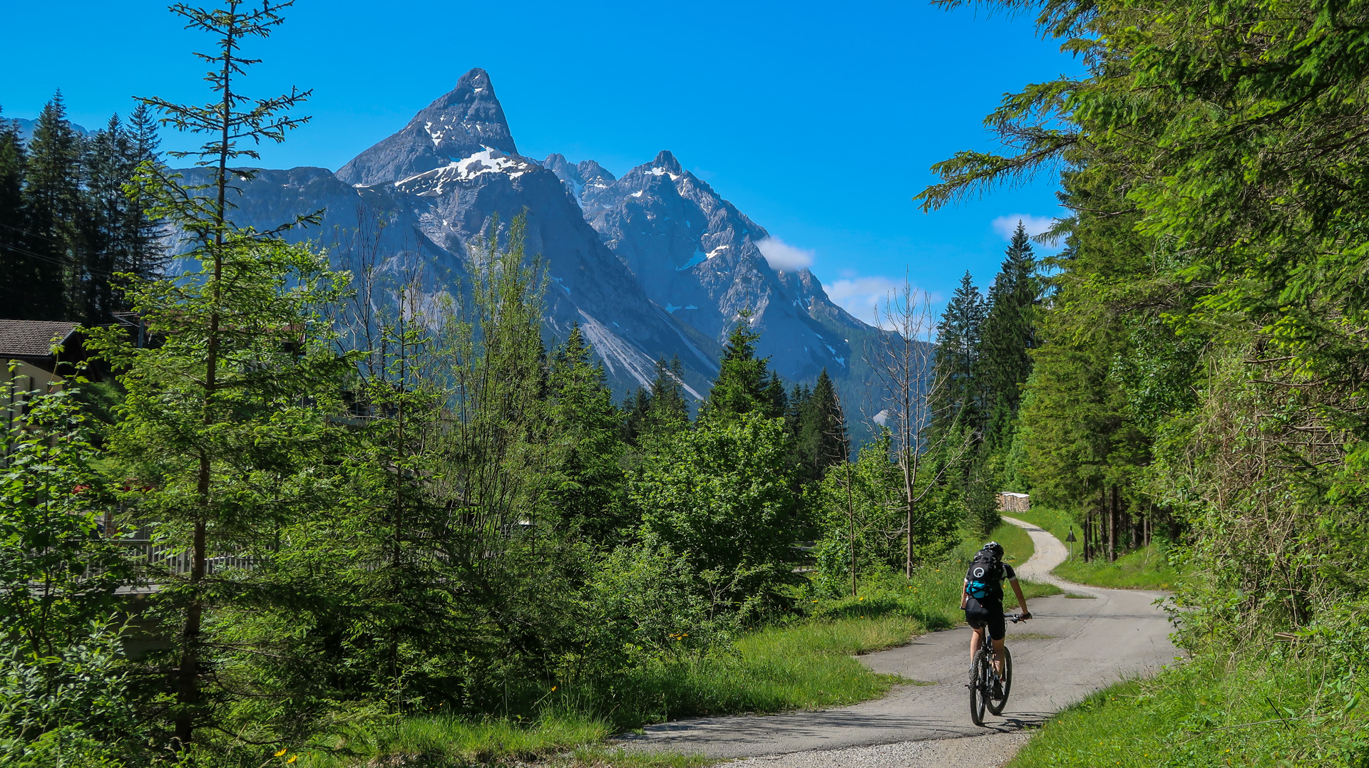 Es geht gemütlich auf dem Radweg am Waldrand entlang. In Grainau treffen wir auf die Loisach, dem Fluss, der sich vom Fernpass herunter schlängelt. Ab hier beginnt der Radweg, der immer ziemlich parallel zur Strasse verläuft, mal geteert, mal Waldboden dann wieder Schotter. Immer sehr gut und einfach fahrbar. Während man hier fährt merkst du kaum, dass der Weg ständig steigt, ist ja auch nicht verwunderlich, bei gerade mal 2% Steigung auf 20 Km. Aber auch so kann man Höhenmeter sammeln. Es werden bei mir Erinnerungen wach, denn 2006 startete auf gleichem Weg mein erster Cross, damals aber im Regen.