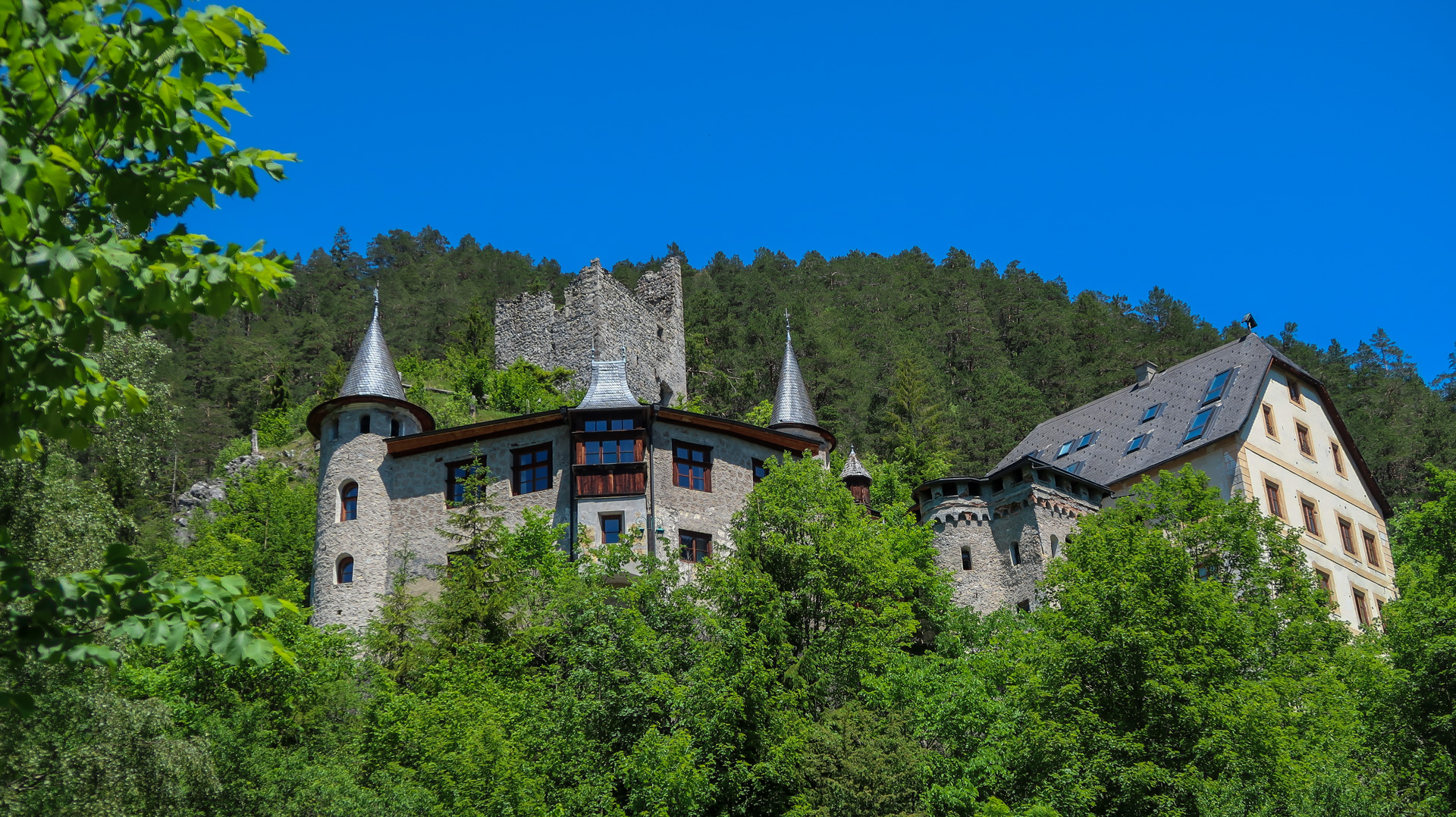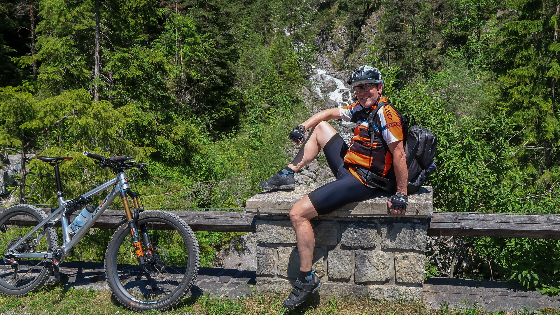 Der erste Gipfel ist erreicht, auch Simone fühlt sich gut, obwohl es sehr warm und schwül geworden ist. Das Foto am Passchild darf natürlich nicht fehlen, dann den Sattel absenken und hinab rauschen, bis wir die Fernpassstraße überquerten. Es folgt eine Holzbrücke, die uns den Weg um eine Felswand ebnet, dann beginnt der Trail bis zum Fernsteinschloß. Auch dieser Weg ist toll zu fahren, 2006 war der sehr verwurzelt und verblockt, jetzt kann man es laufen lassen. Simone hat ein Grinsen im Gesicht, mehr brauch ich dazu nicht zu sagen.
