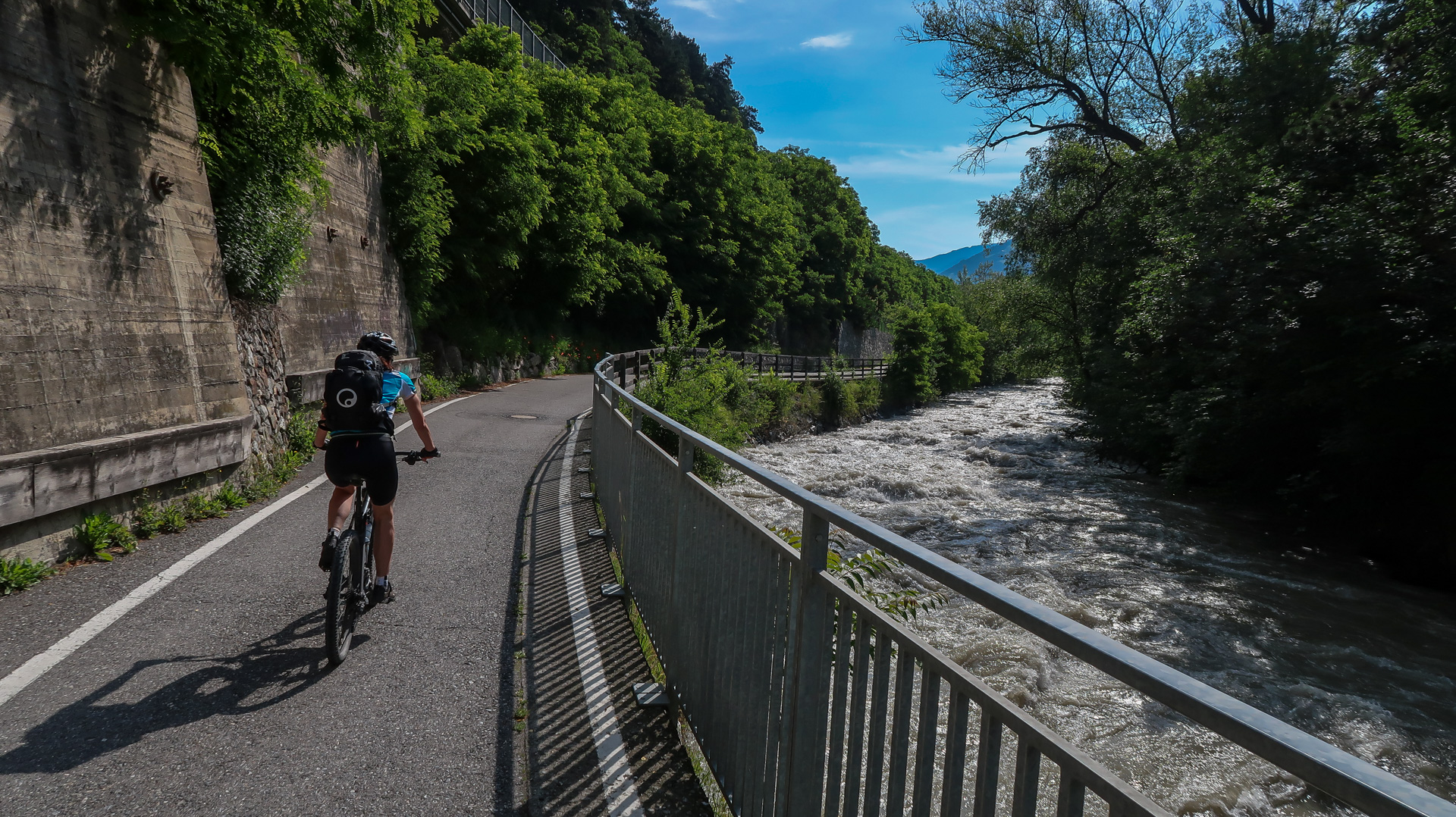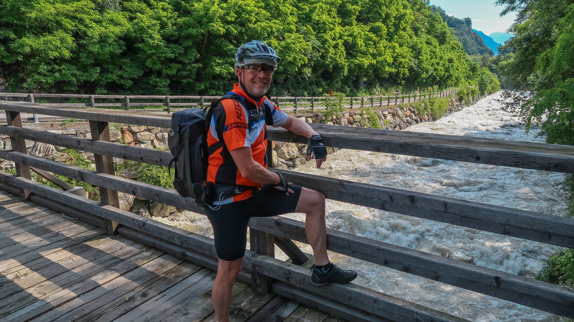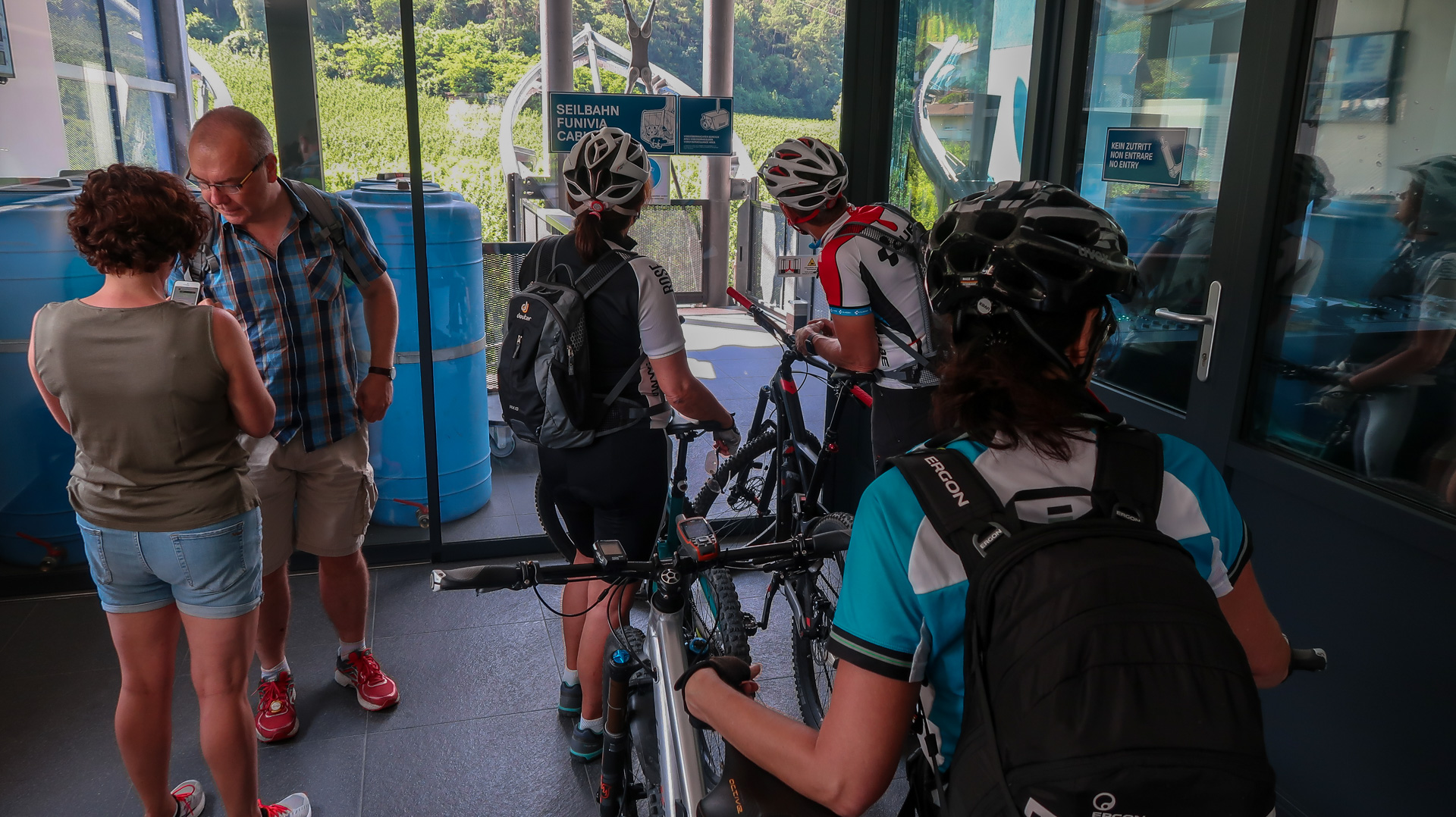 Gut gestärkt durch ein klasse Frühstück machen wir los. Die ersten 28 km auf Radweg nach Raabland verfliegen gerade so, es geht immer leicht bergab, sanfte Abkühlung erfolgt durch den uns begleiteten Fluss Etsch. An der Gondelstation gönnen wir uns eine Kleinigkeit zu trinken, die 800 m Auffahrt macht Spaß ohne mal kurbeln zu müssen.