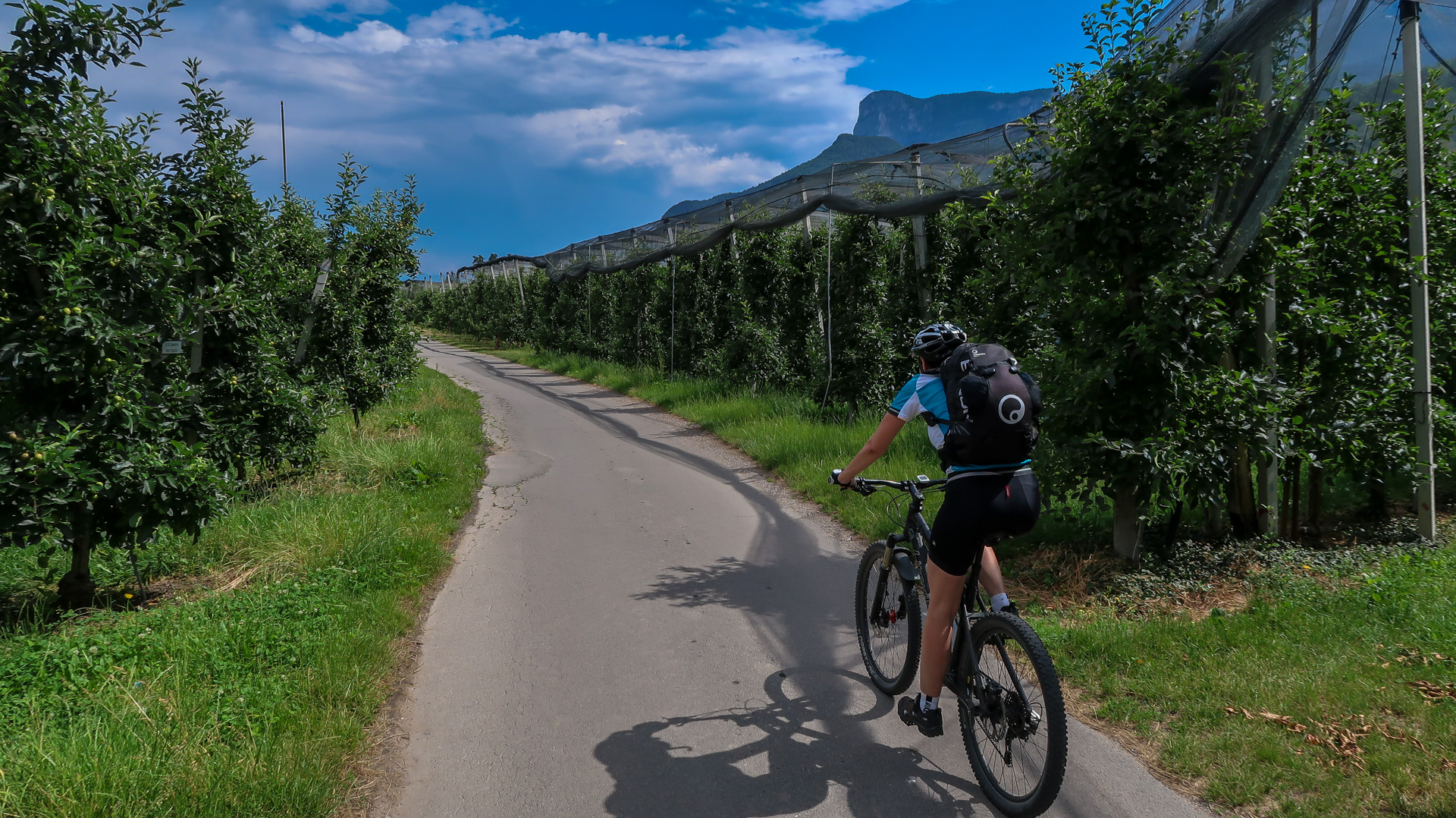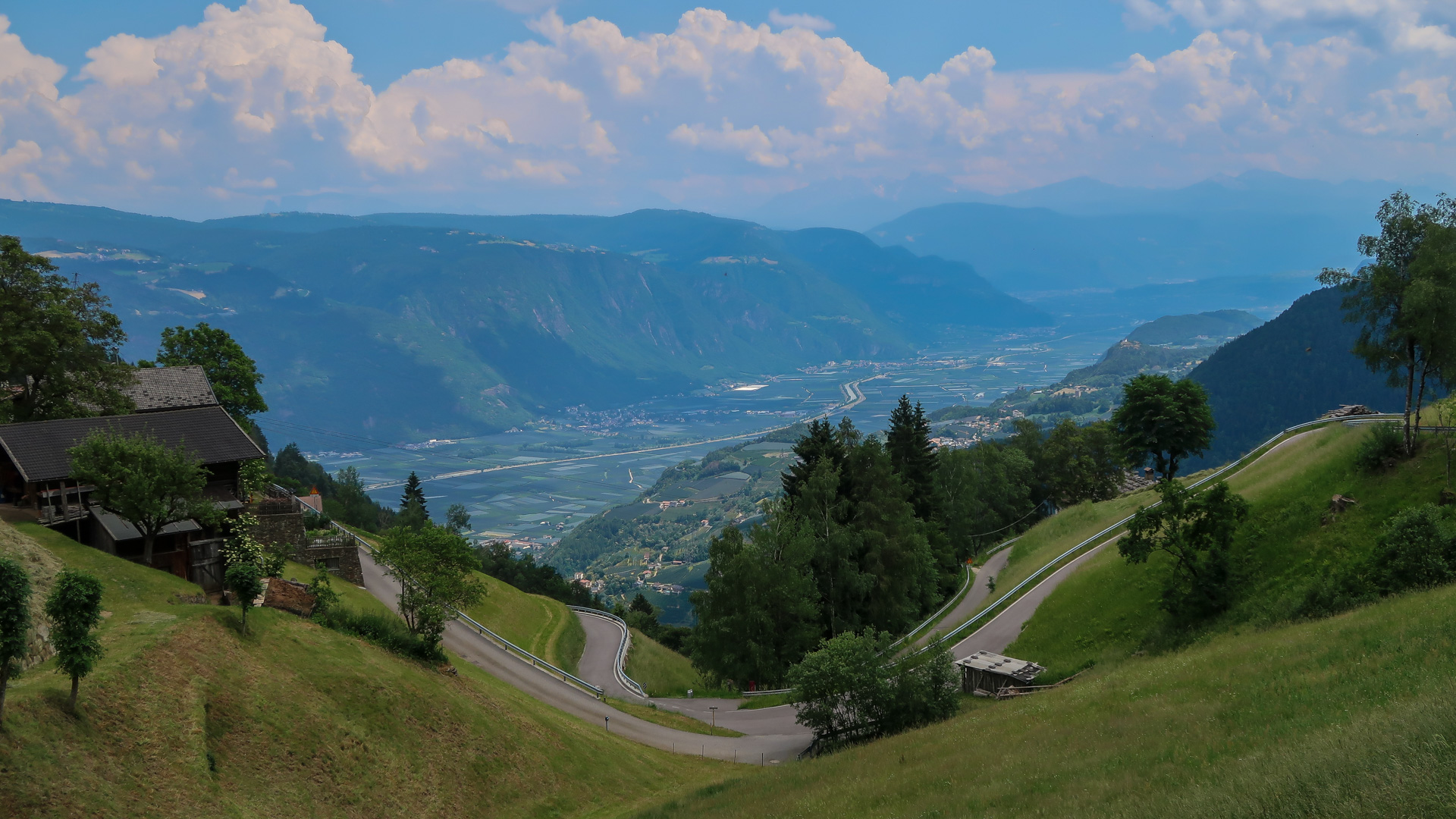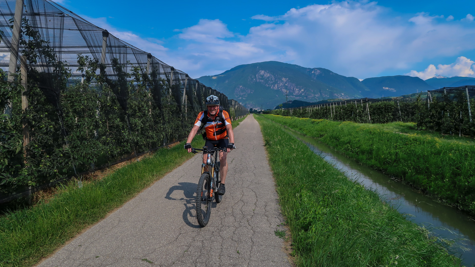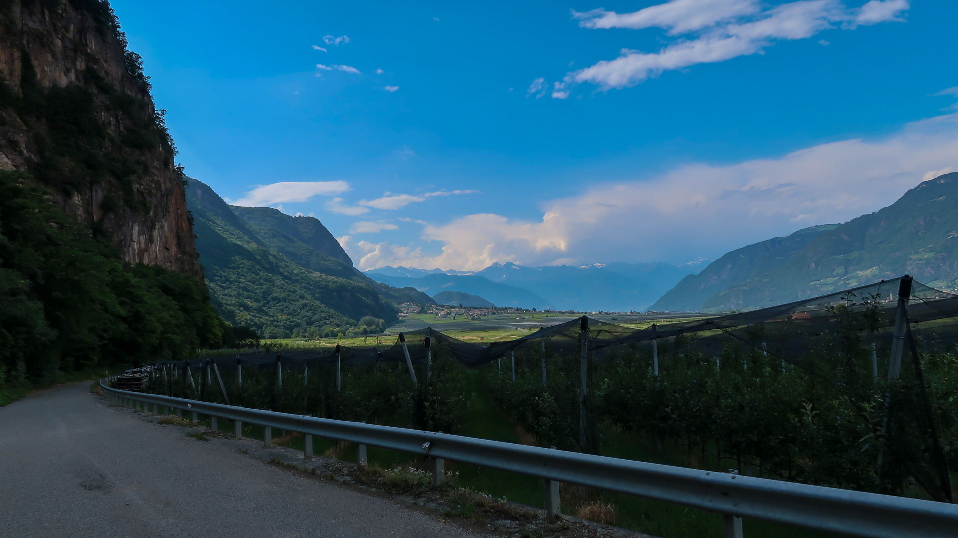 Heute gibt es wieder zwei Möglichkeiten der Streckenführung: Über den Radweg nach Maran und dann weiter nach Eppan oder unsere ausgewählte Variante bis nach Raabland, mit der Seilbahn nach Aschbach um dann 600 hm zur Naturnseralm um übers Vigiljoch nach Eppan zu fahren.