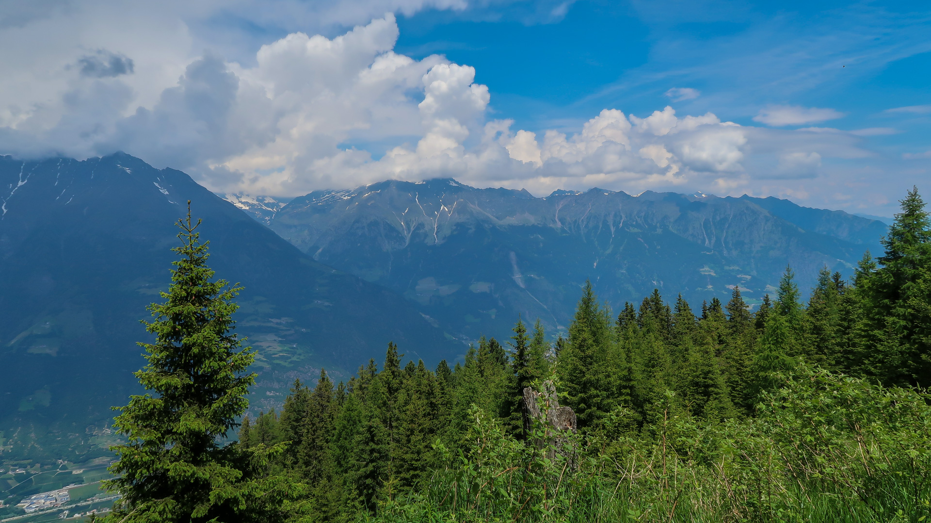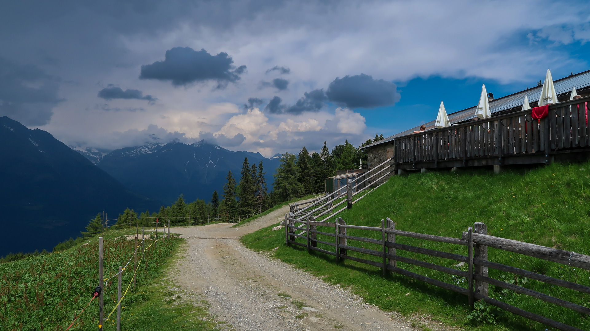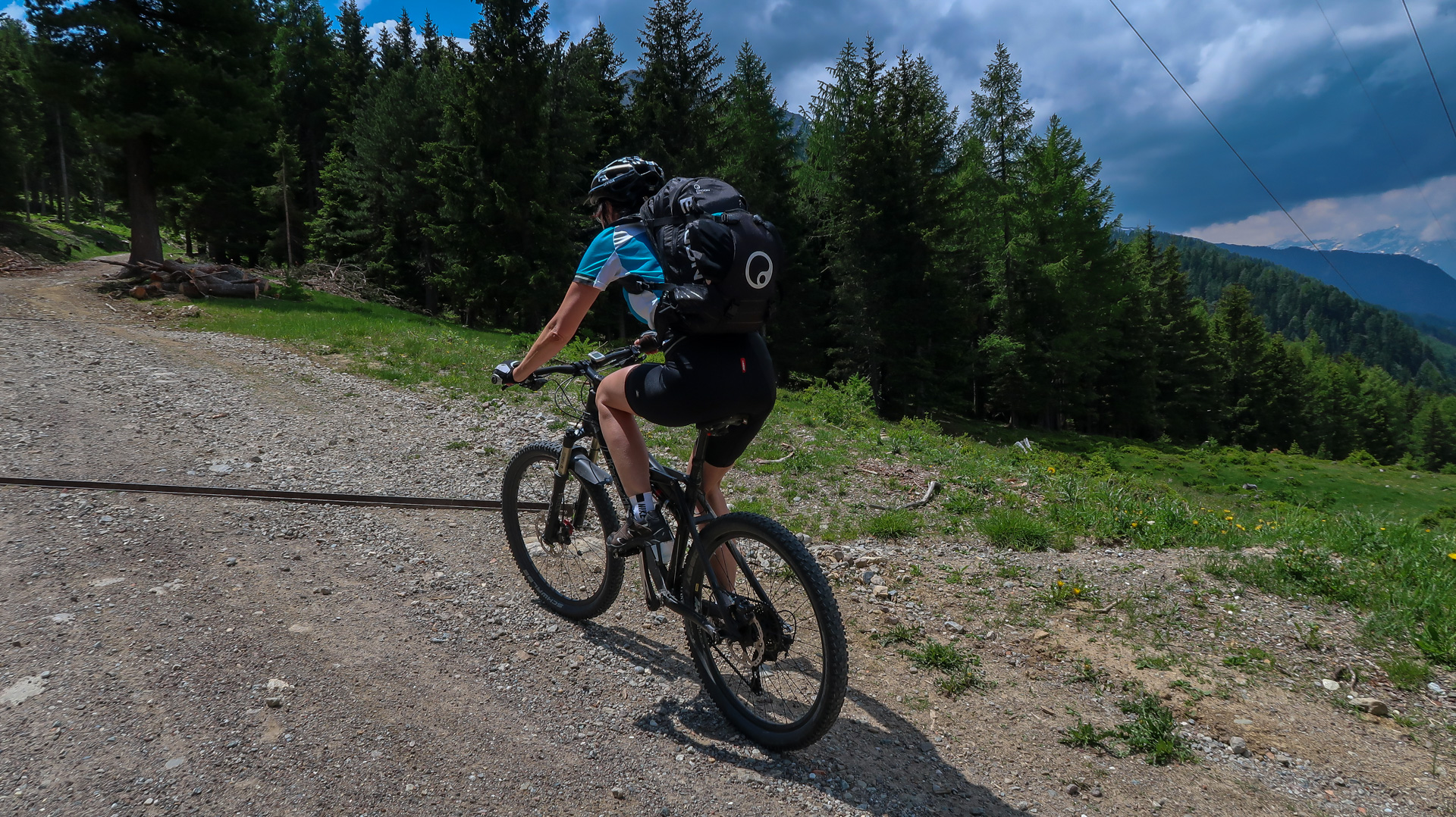Auf den nächsten 7 km dürfen wir 600 hm überwinden, das sind im Schnitt 8,5 % Steigung. Was nicht heißt, dass auch mal Rampen von 15% dabei sind, dafür gibt es auch ein paar flache Stellen. Zum Glück verläuft ein Großteil der Strecke im schattigen Wald. Ab & zu gibt uns dieser die Sicht hinab ins Vinschgau frei. Was wir dort sehen gefällt uns gar nicht. Dunkle Gewitterwolken. In der Ferne hören wir die ersten Donner. Erst mal weiter kurbeln zur Alm, denn sollte es heftiger werden, sind wir da oben in Sicherheit. Langsam aber ständig treten wir uns nach oben, Simone in ihrem eigenen Tritt, ich folge ihr. Nur nichts überstürzen und am Anfang eines Berges überziehen, auch 600 hm können unendlich erscheinen. Aber das macht sie genau richtig.