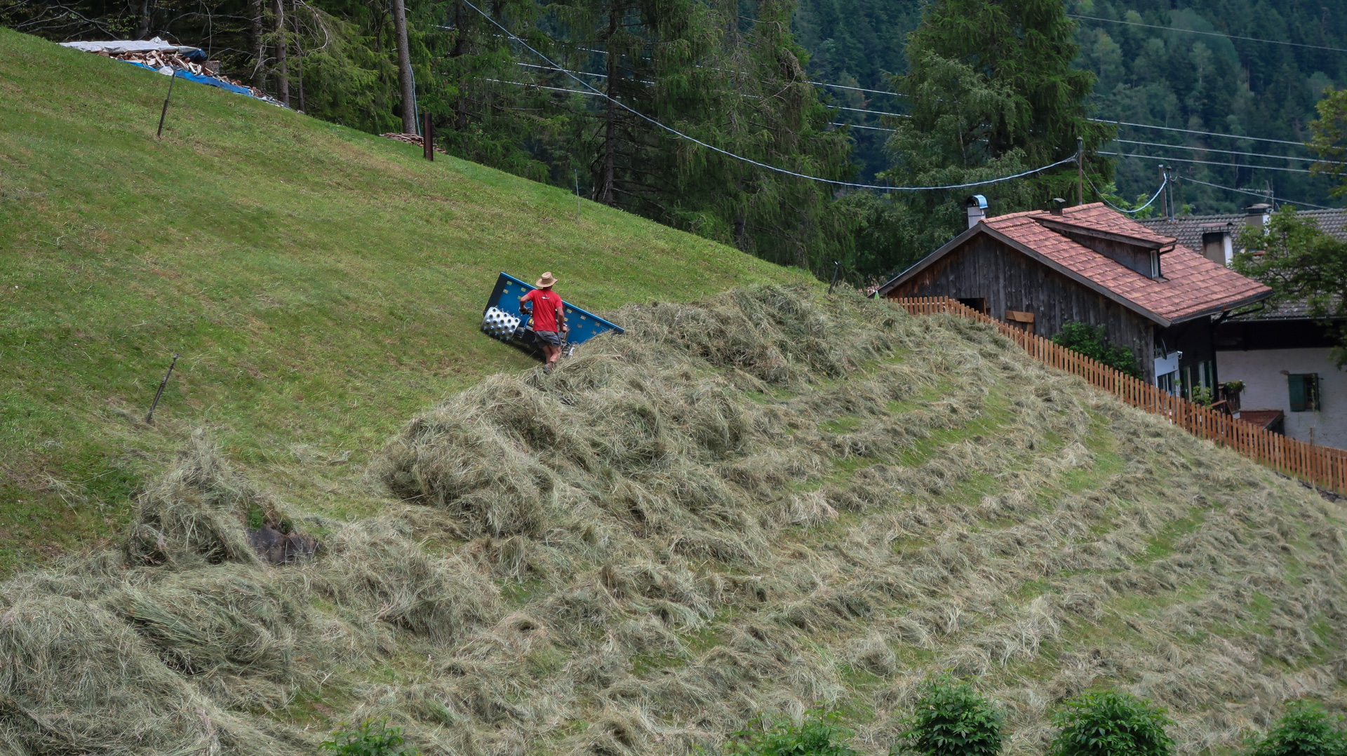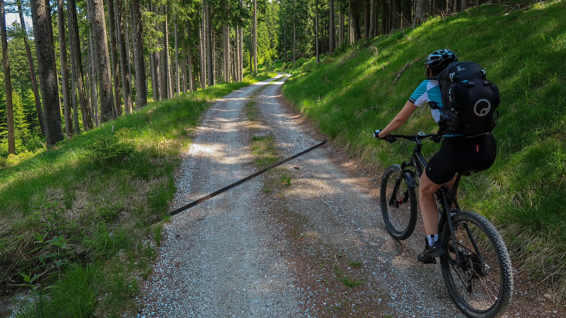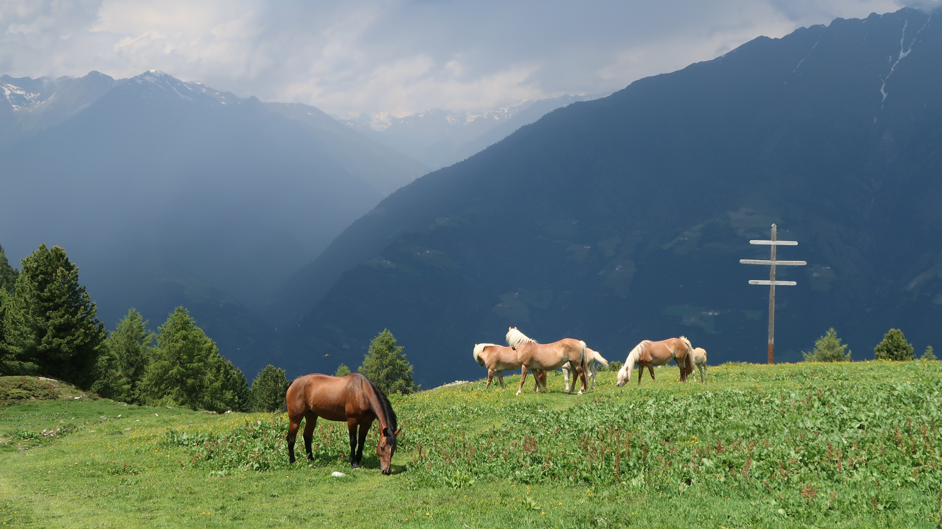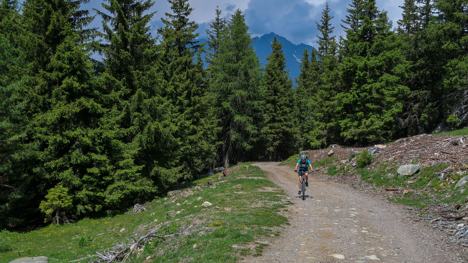 Auf den nächsten 7 km dürfen wir 600 hm überwinden, das sind im Schnitt 8,5 % Steigung. Was nicht heißt, dass auch mal Rampen von 15% dabei sind, dafür gibt es auch ein paar flache Stellen. Zum Glück verläuft ein Großteil der Strecke im schattigen Wald. Ab & zu gibt uns dieser die Sicht hinab ins Vinschgau frei. Was wir dort sehen gefällt uns gar nicht. Dunkle Gewitterwolken. In der Ferne hören wir die ersten Donner. Erst mal weiter kurbeln zur Alm, denn sollte es heftiger werden, sind wir da oben in Sicherheit. Langsam aber ständig treten wir uns nach oben, Simone in ihrem eigenen Tritt, ich folge ihr. Nur nichts überstürzen und am Anfang eines Berges überziehen, auch 600 hm können unendlich erscheinen. Aber das macht sie genau richtig.