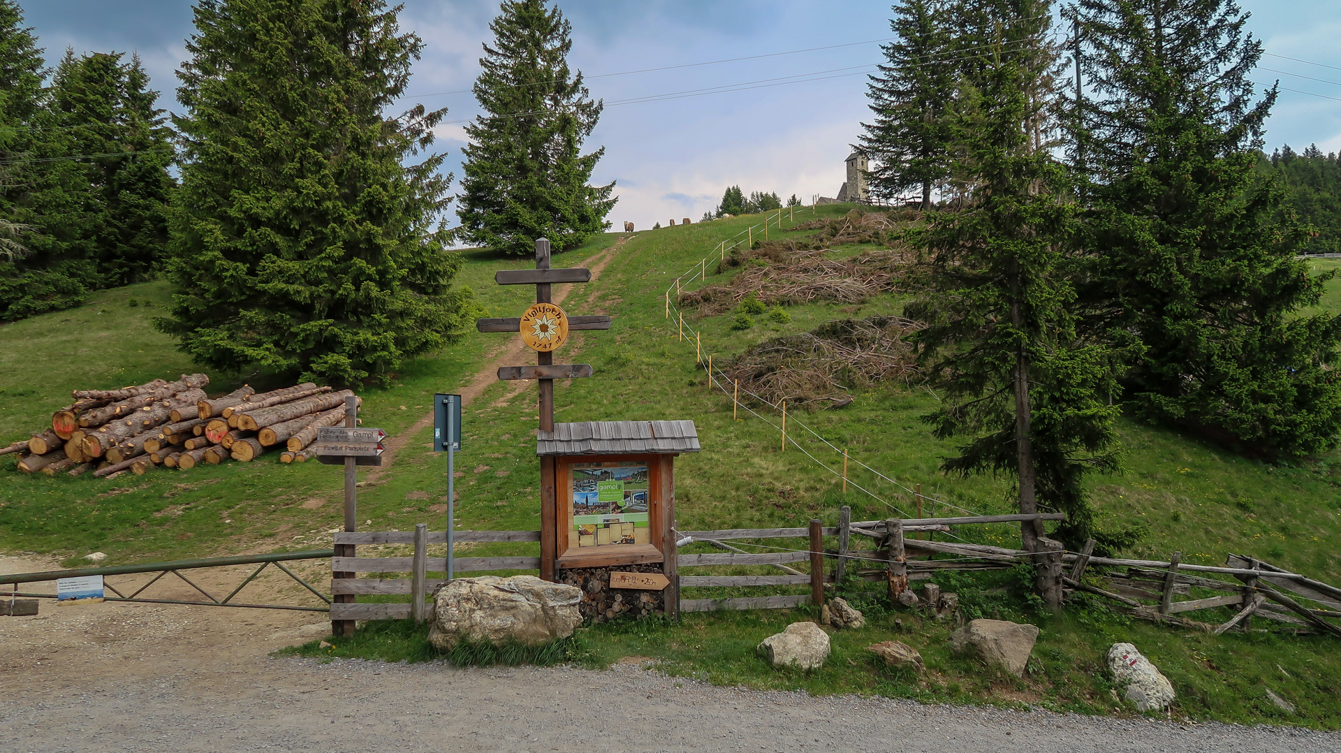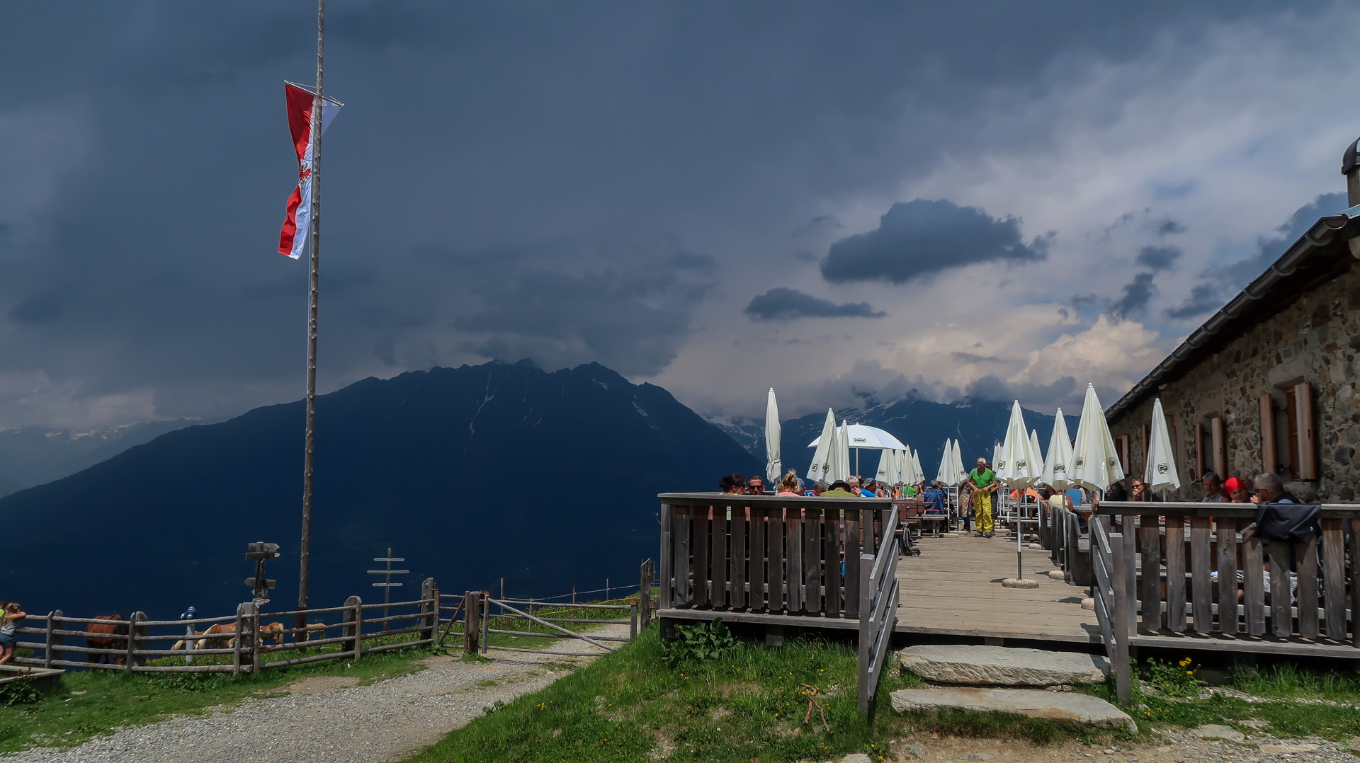 Die Donner werden häufiger, die Sonne ist verschwunden, es ist drückend heiß und auf der Alm sind es 30 Grad auf 1.922 m. Wir erhaschen einen Blick auf die andere Seite der Alm, wo unser Weg weiter führen soll und sieh da, strahlen blauer Himmel. Was für ein Kontrast. Die Alm ist also der Scheitelpunkt der Schlecht-Wetter-Front. Solange es bei uns nicht regnet genießen wir auf einer Bank eine Kleinigkeit zu Essen und zwei kühle Weizenbier. Im Tal schüttet, donnert und blitzt es.