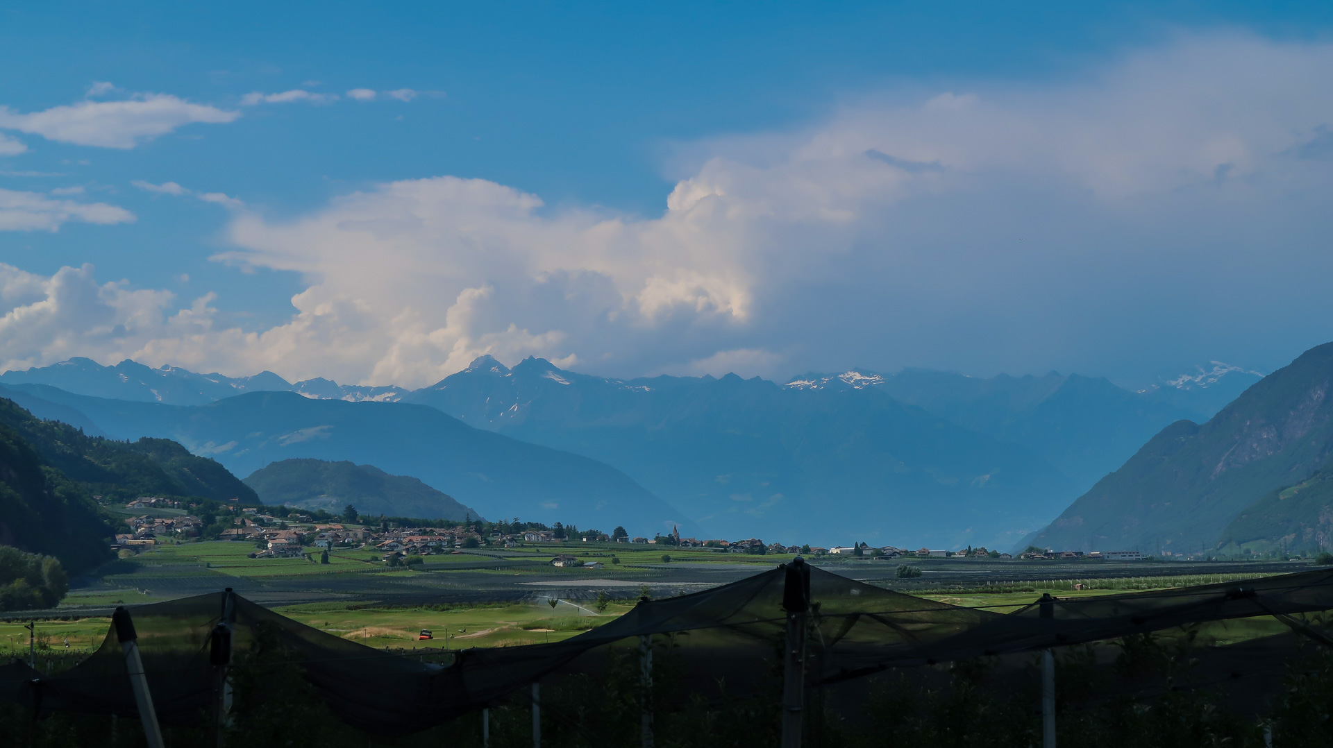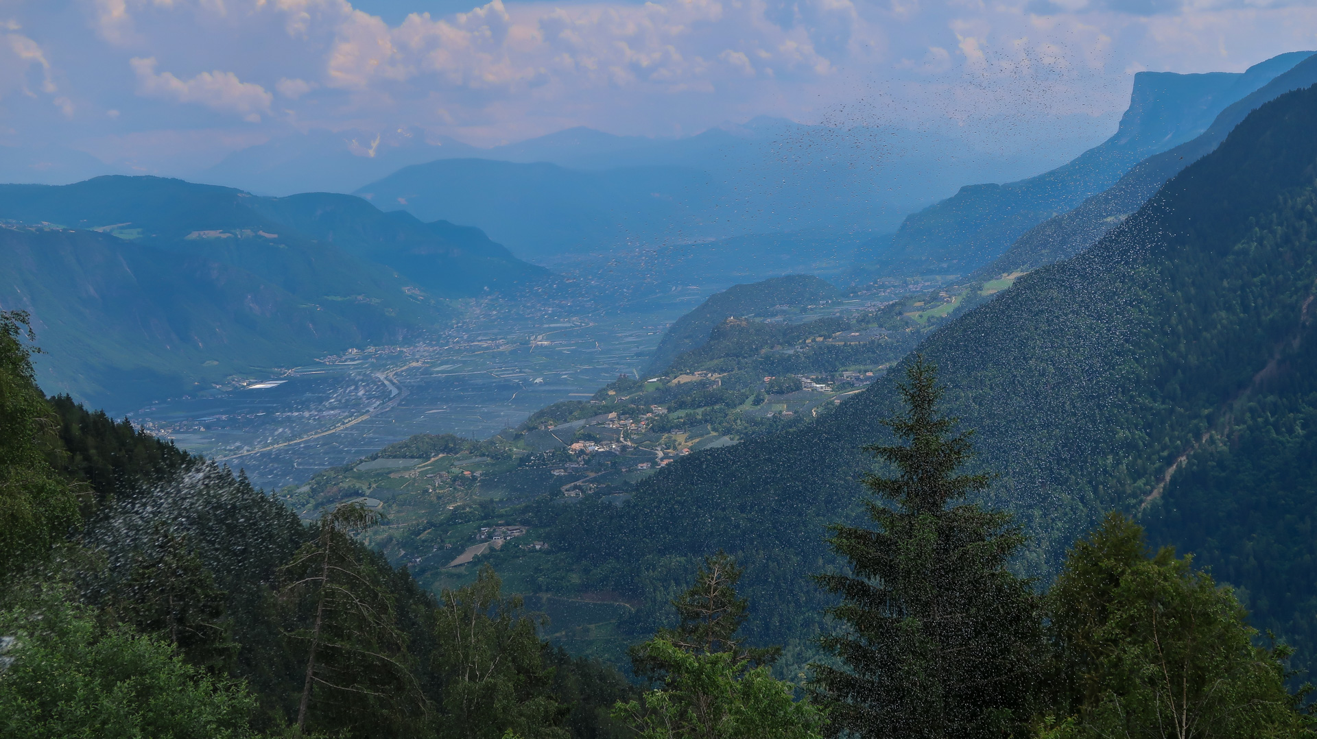 Die Wetterapp zeigt, dass diese Gewitterfront nicht in Richtung unseres heuten Etappenziel zieht. Somit nehmen wir den nächsten Abschnitt unserer Route in Angriff. Erst noch mal weiter hinauf zum höchsten Punkt unserer Alpenüberquerung auf 2.190 m, dann rüber zum Vigiljoch auf 1.747 m, um uns anschließend hinab nach Lana auf 250 m zu stürzen. Tolle Wege, teils Trails, teils Schotter, beigleitet durch herrliche Fernblicke hinab ins Tal. Das könnte ewig so weiter führen. Ab und zu ist stehen bleiben angesagt, um die Bremsen abkühlen zu lassen. Auch die Hände bedanken sich dafür. Im Hintergrund das Grollen des Donners aus dem Vinschgau. Die drückende Hitze, die, je weiter wir nach unten gelangen wie ein heißer Föhn auf den Körper trifft. Das alles macht uns dennoch einen mords Spaß.