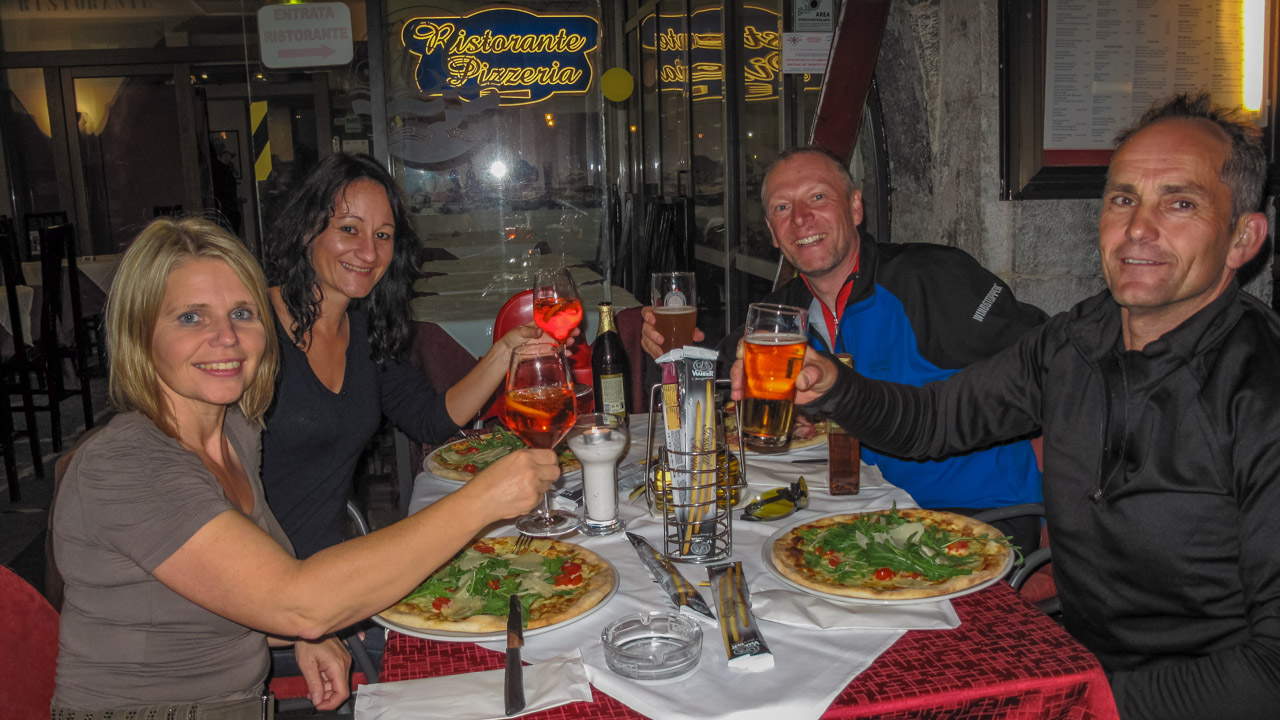 Ich mache es kurz: Um 21:00 Uhr erreichen wir völlig fertig den Marktplatz von Riva. Vom Tremalzo Tunnel haben wir doch sage und schreibe 3,5 Std. gebraucht. Erleichtert begrüßen wir unsere Frauen, suchen uns ein Lokal und gönnen uns erst einmal ein tolles Essen… was für ein Trip!